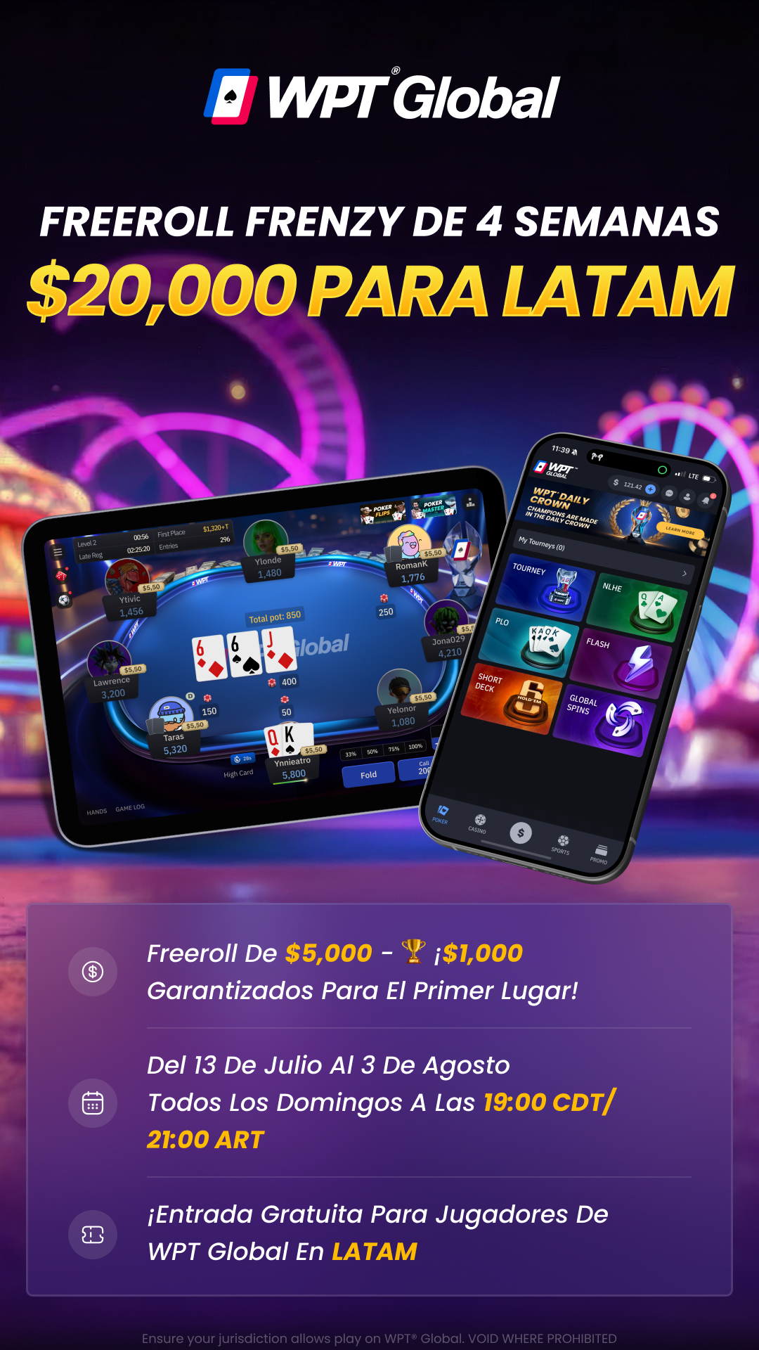 Todos los jugadores de WPT® Global en la región reciben 1 ticket gratuito por semana.
