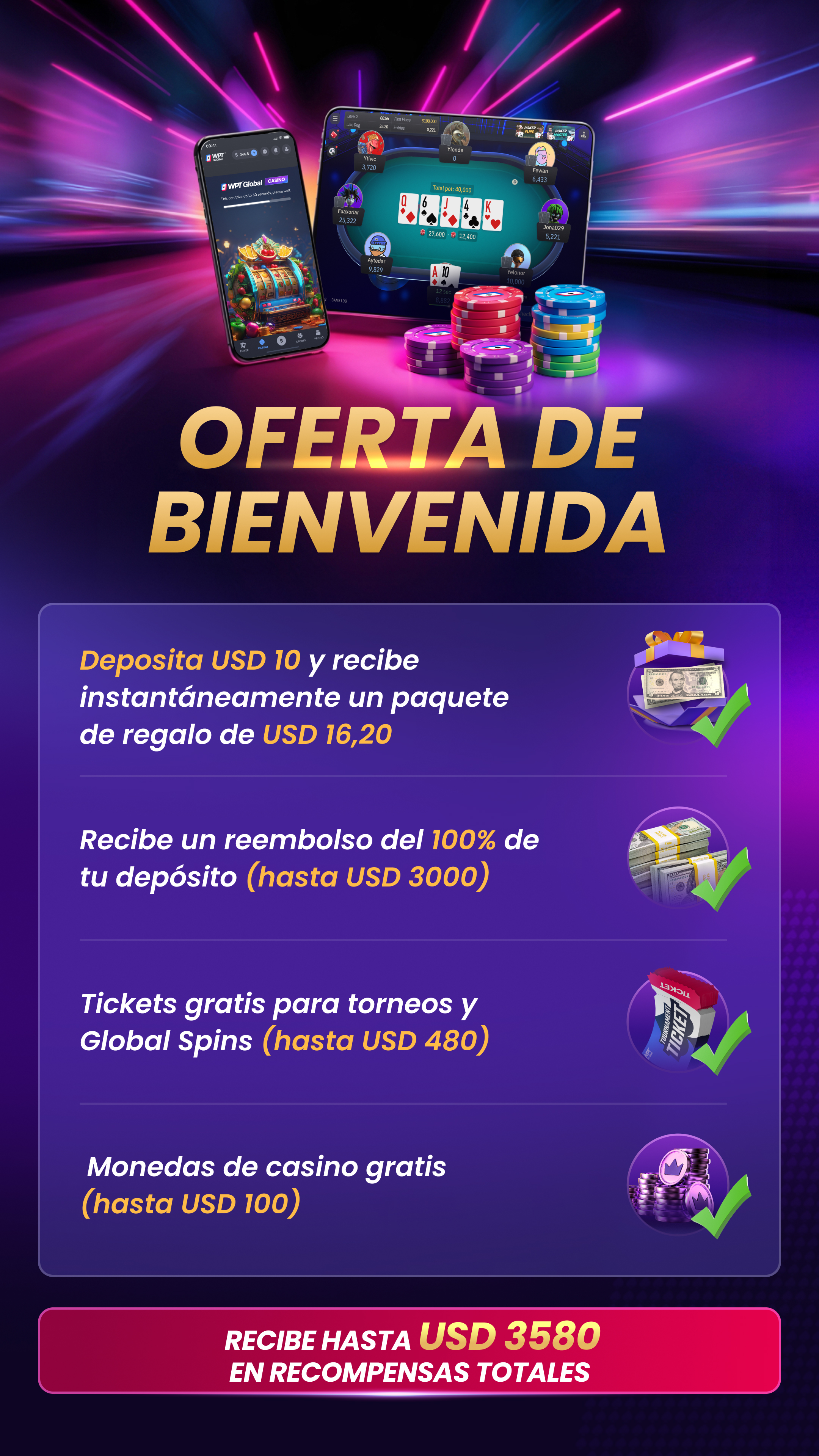 También te regalamos tickets para torneos y Global Spins al unirte a WPT Global como cliente nuevo.