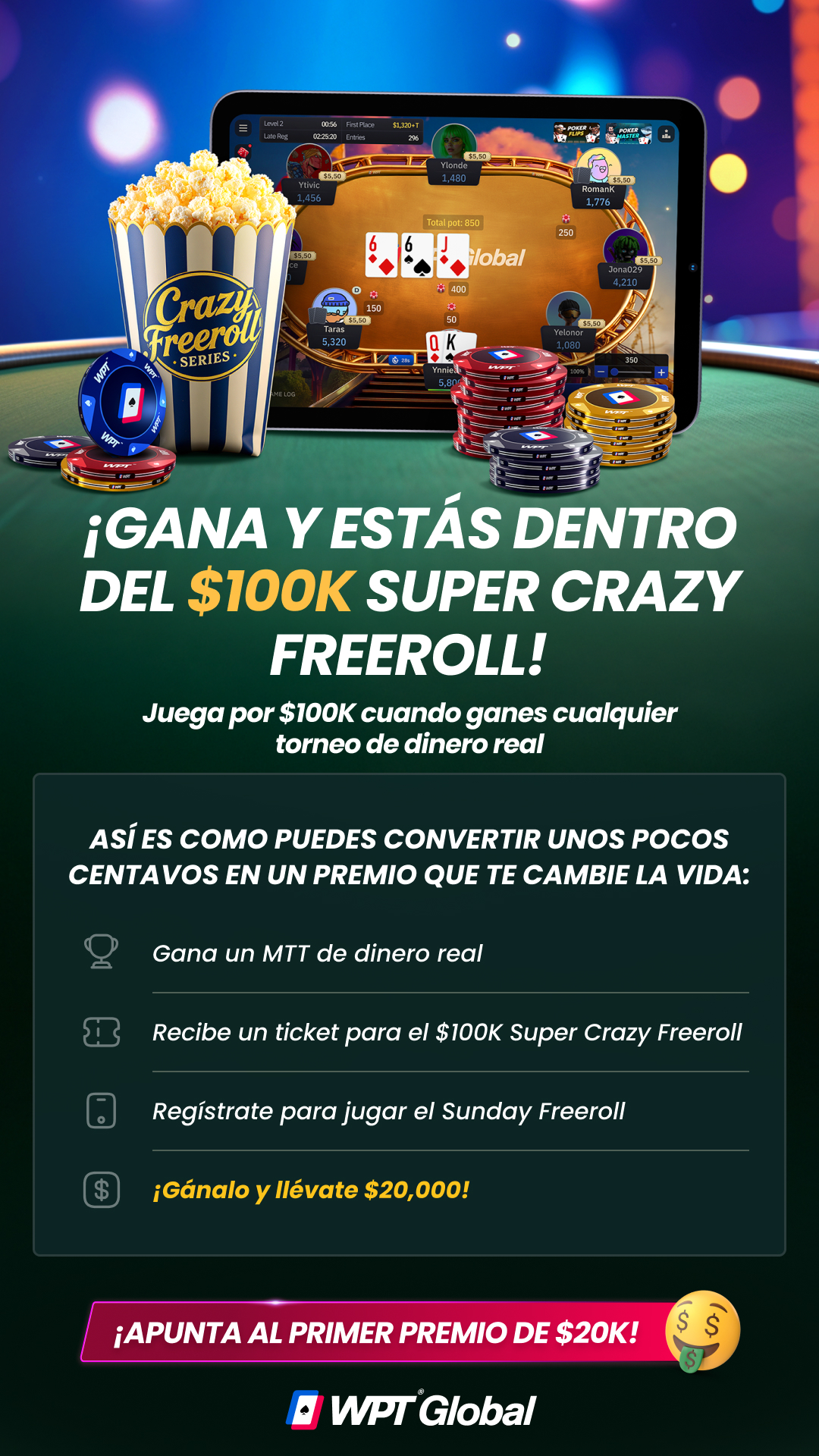 Gana cualquier torneo de WPT® Global y tendrás tu lugar en el próximo Super Crazy Freeroll de $100,000.
