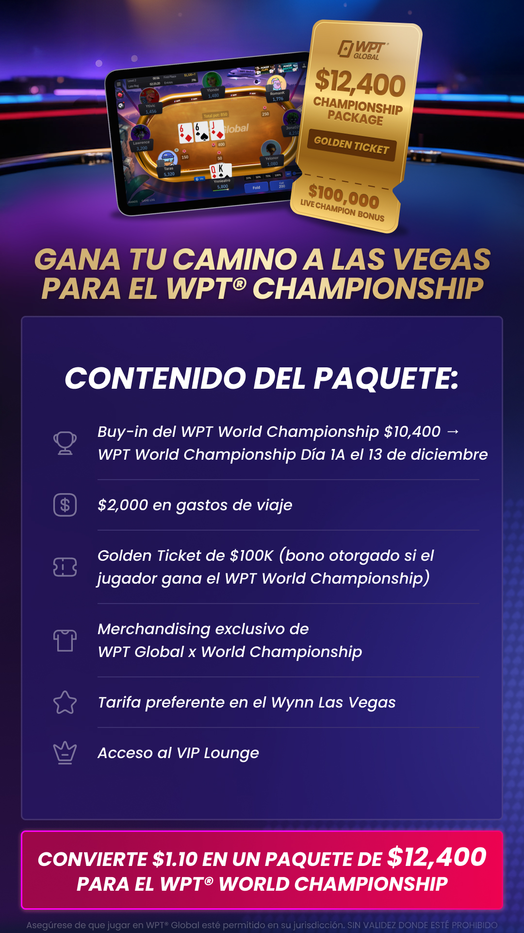 - Entrada de $10,400 al Main Event del WPT® World Championship, que se jugará del 13 al 21 de diciembre de 2025 en el Wynn Las Vegas