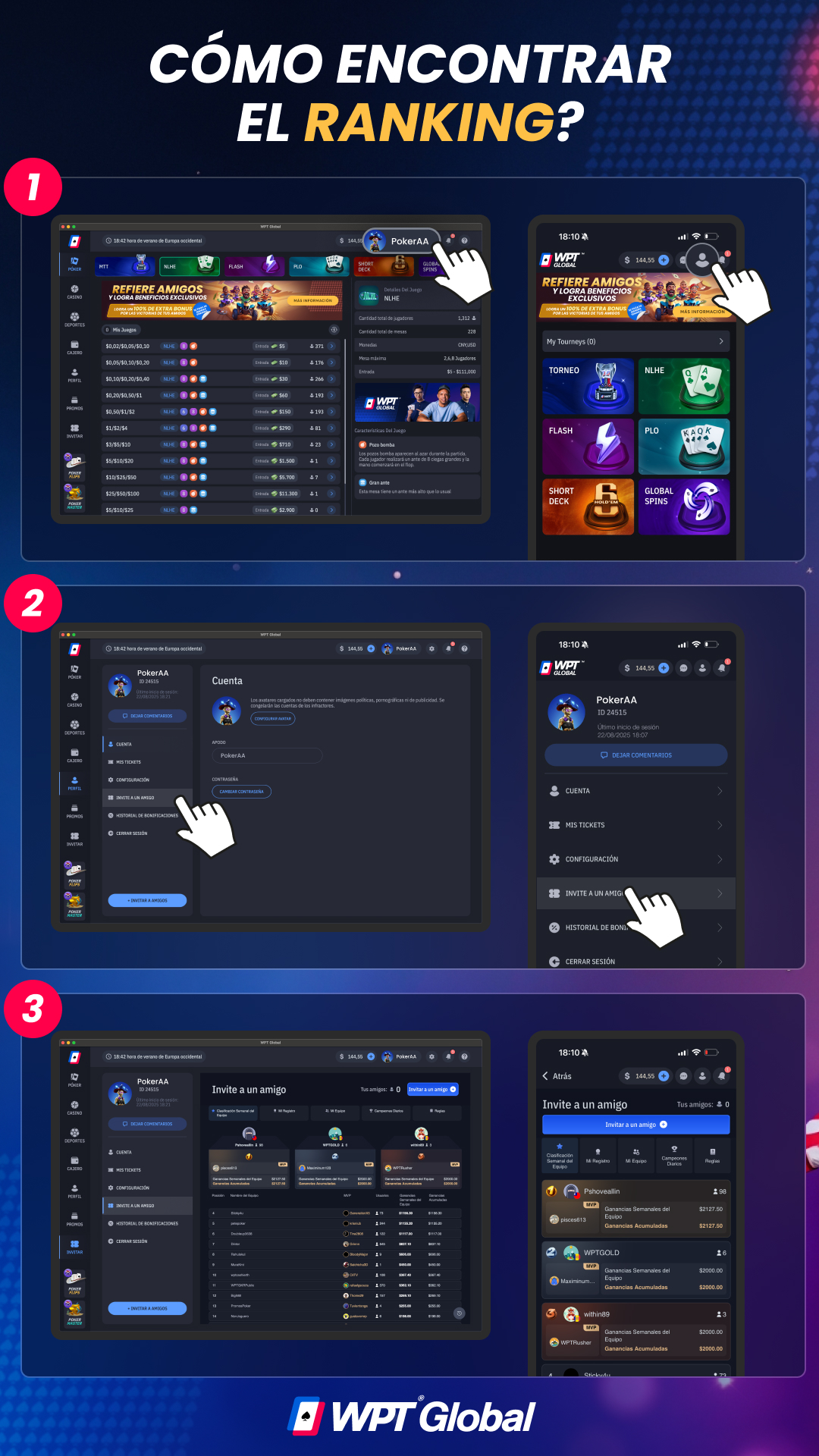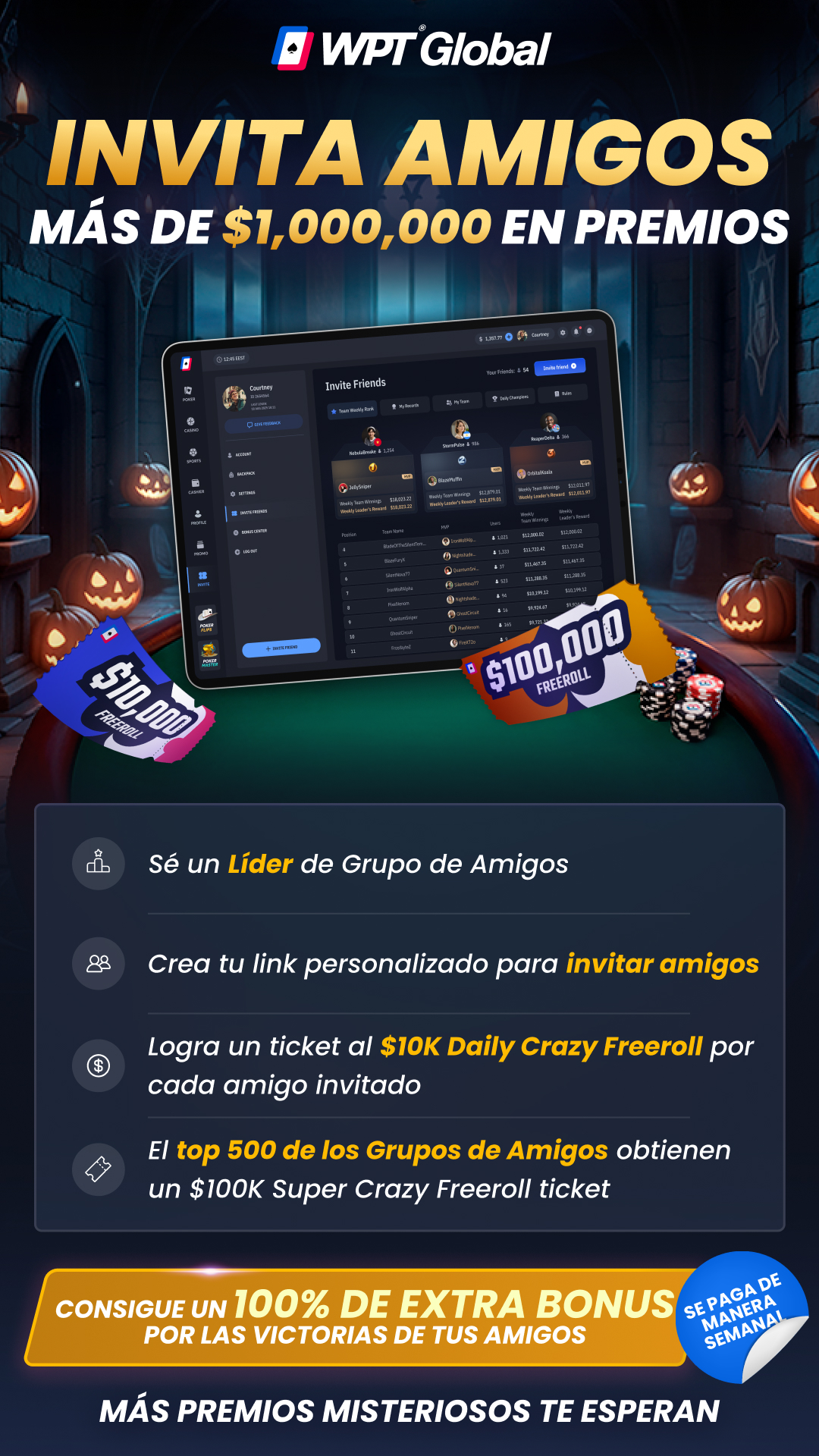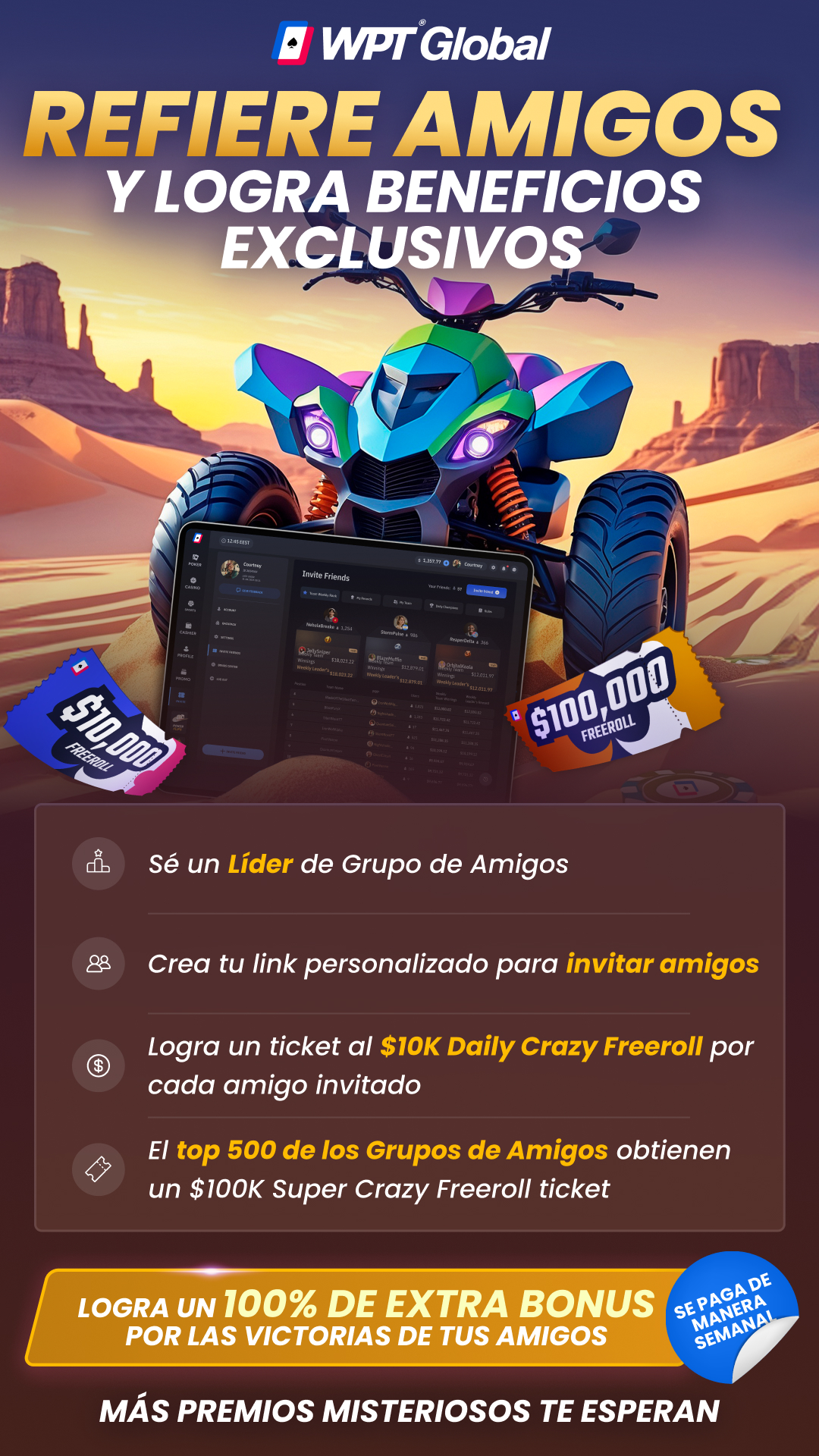 Trae a tus amigos a WPT® Global y podrás ganar increíbles recompensas con nuestra promoción exclusiva Grupo de Amigos.