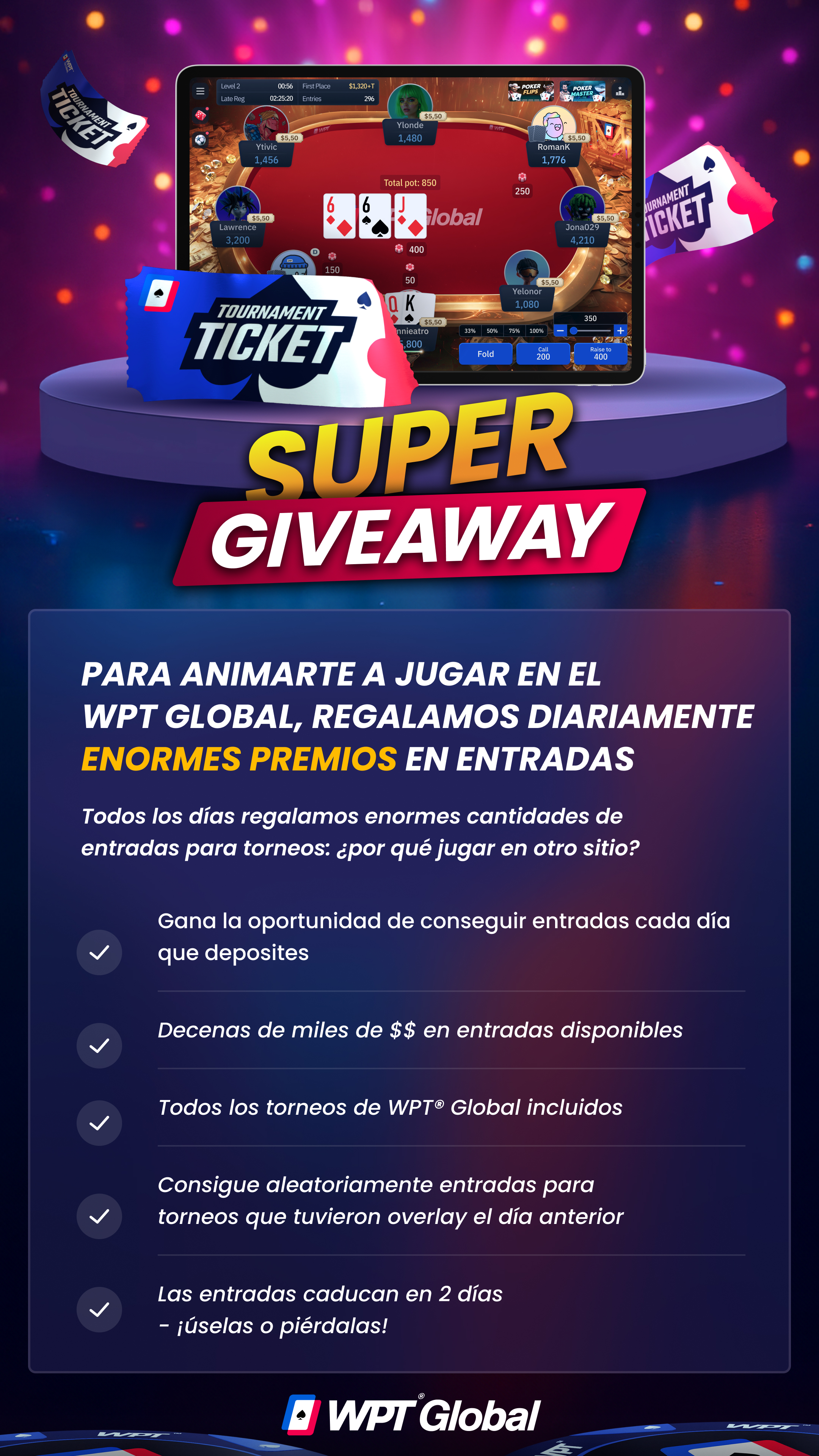 Consigue una ticket GRATUITO para cualquier torneo del calendario de WPT® Global con tu próximo depósito gracias al Super Giveaway de WPT® Global.