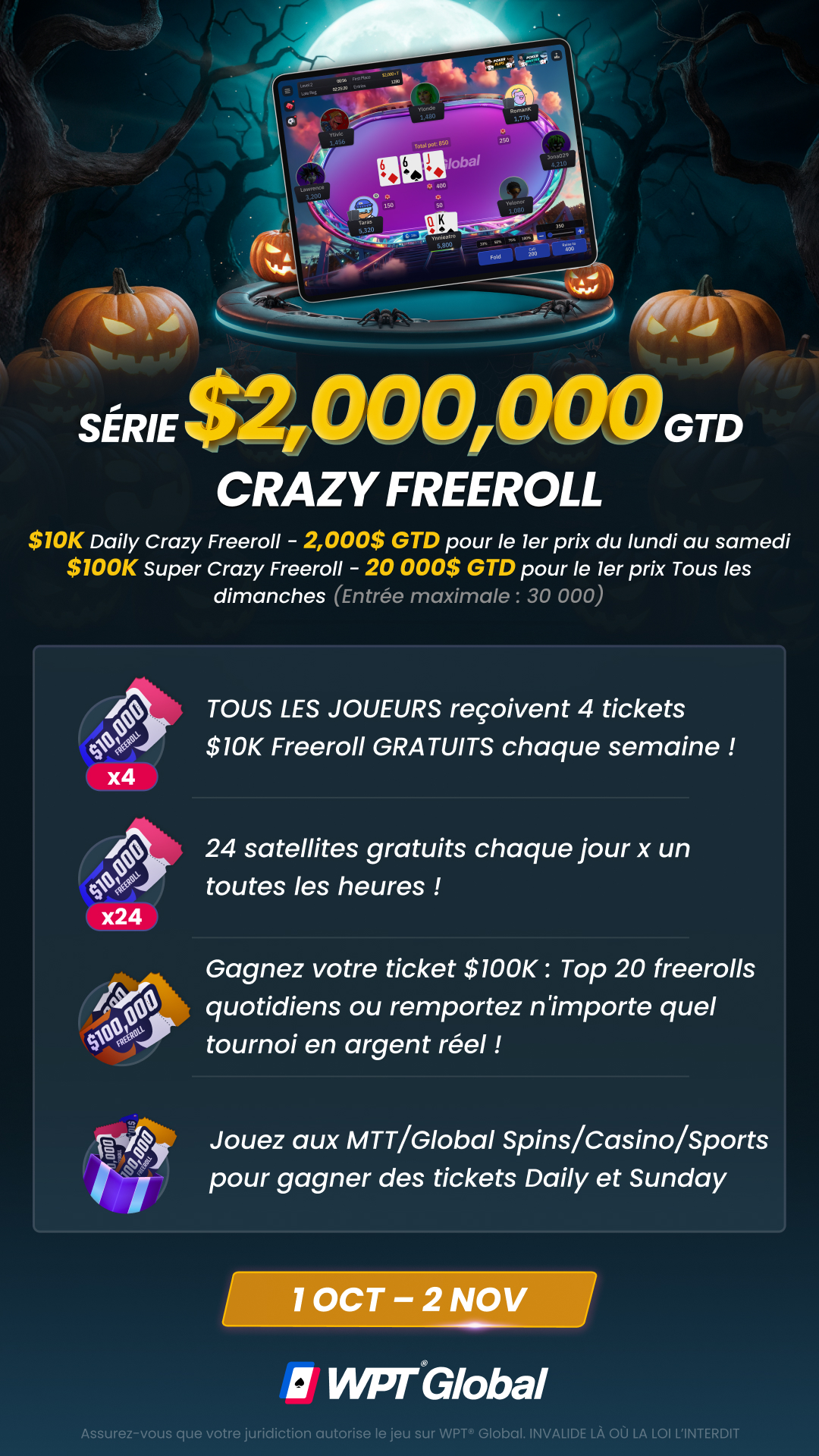 On devient fous de Freerolls chez WPT® Global, et nous vous donnons 2 millions $ GRATUITEMENT.