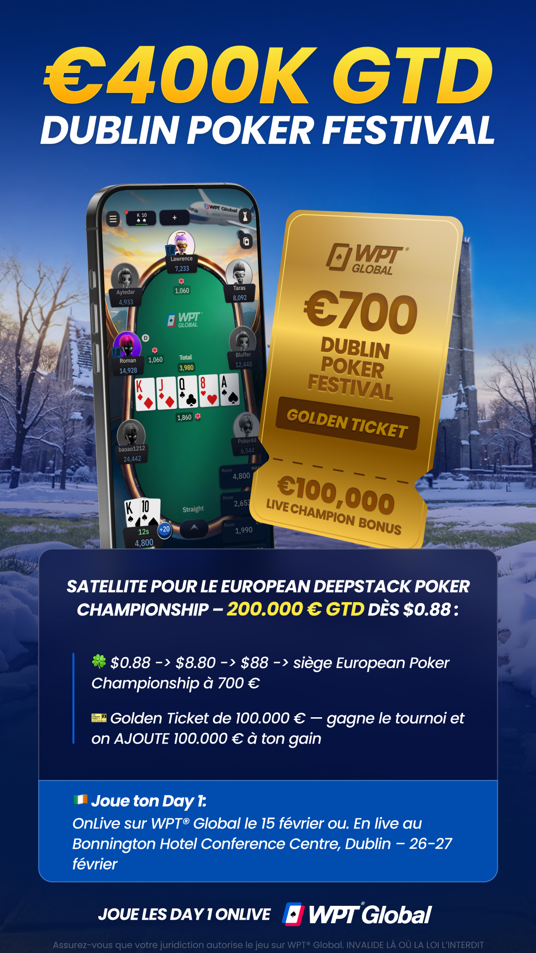 Joue pour plus de 400.000 € garantis et pour le bonus supplémentaire de 100.000 € réservé aux détenteurs du Golden Ticket WPT® Global, le tout sur 10 jours d’action poker à Dublin !