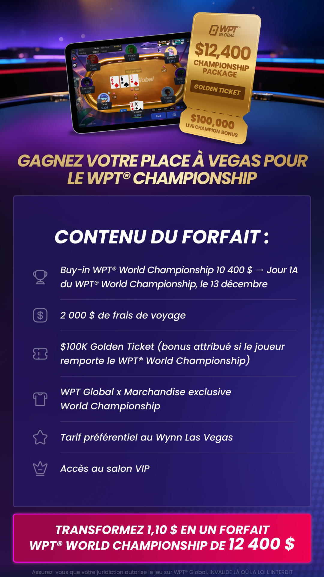 - Une entrée de 10 400 $ pour le Main Event du WPT® World Championship, qui se déroulera du 13 au 21 décembre 2025 au Wynn Las Vegas.
