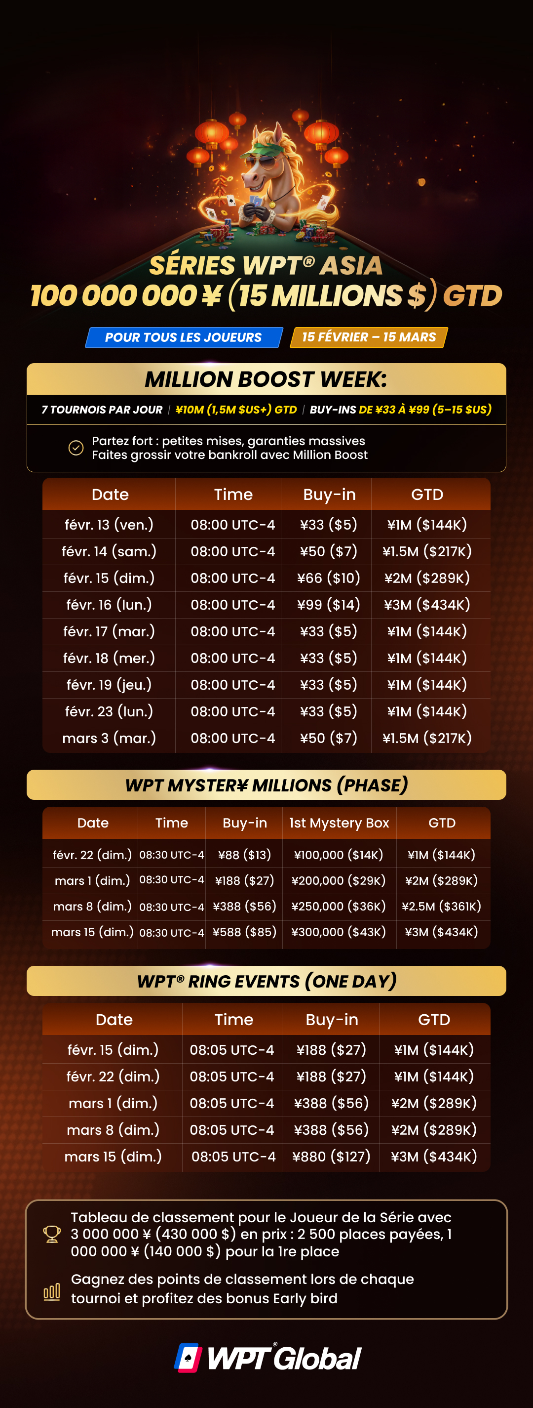 La WPT® Asia Series débute avec une Million Boost Week (13–17 fév.) :