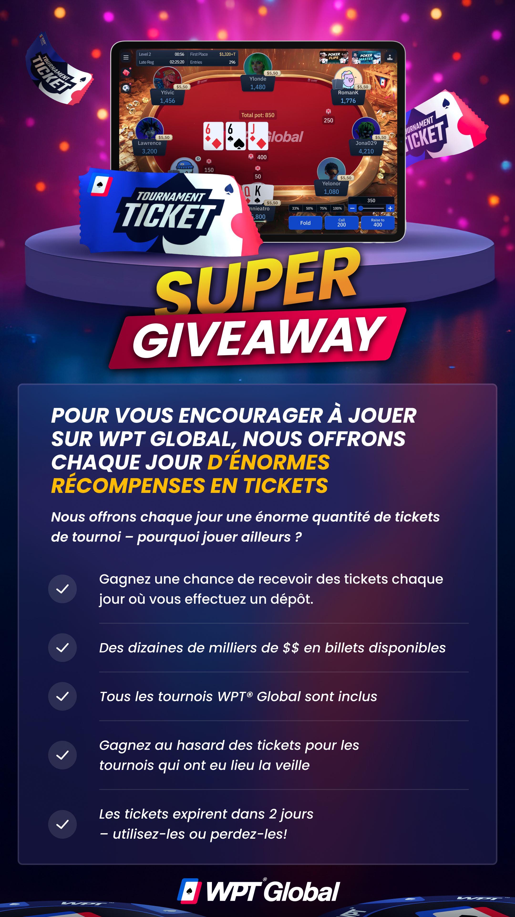 Obtenez une ENTRÉE GRATUITE pour n’importe quel tournoi du programme WPT® Global grâce au Super Giveaway de WPT® Global.
