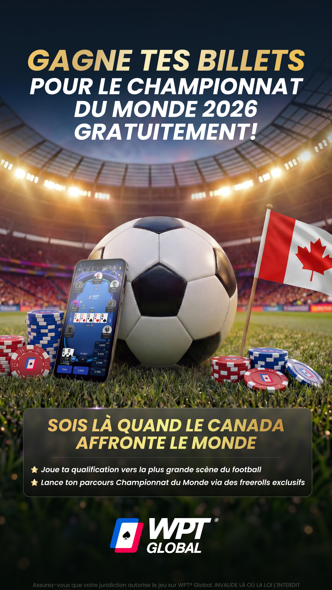 Nous vous envoyons assister au match de groupe du Championnat du Monde de votre choix parmi les trois matchs du Canada, avec des satellites à partir de seulement 3,30 $ et des parcours via Freerolls réservés exclusivement aux joueurs canadiens.