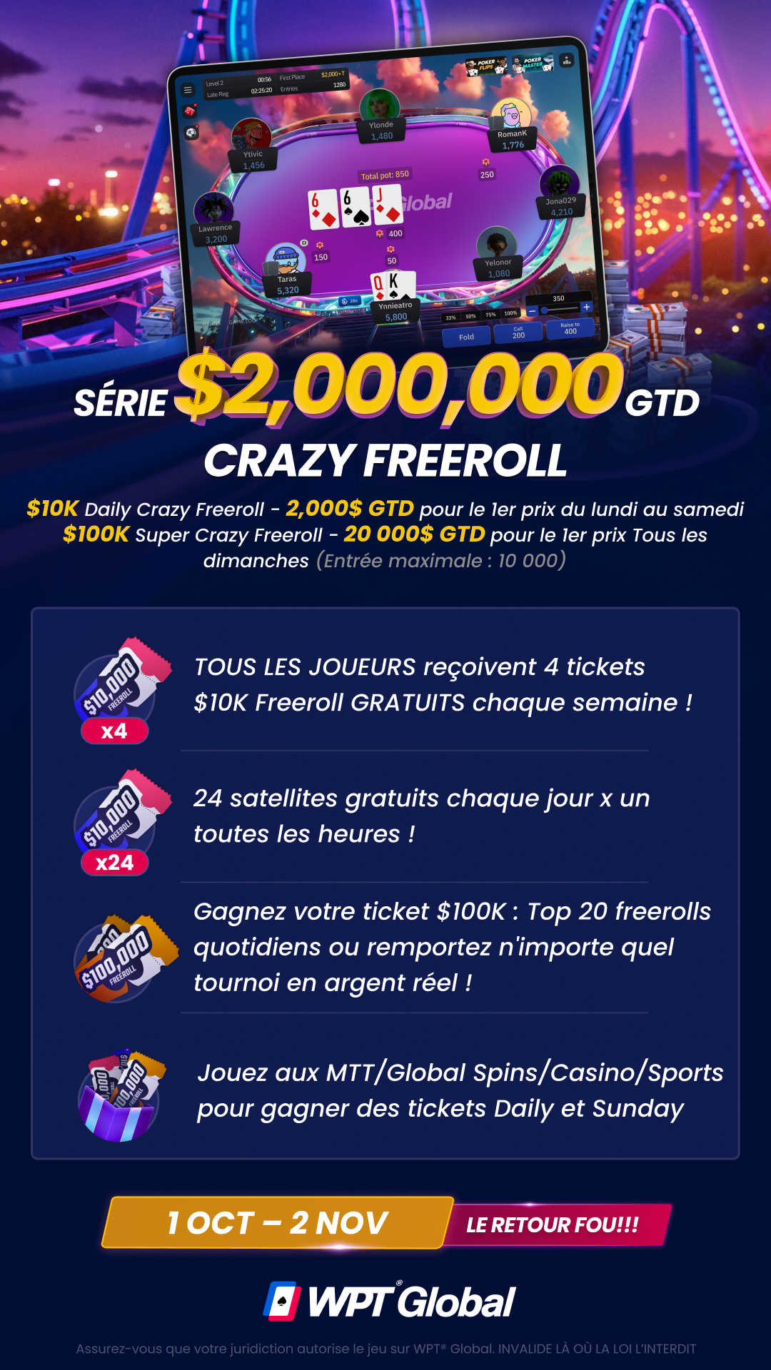 On devient fous de Freerolls chez WPT® Global, et nous vous donnons 2 millions $ GRATUITEMENT.