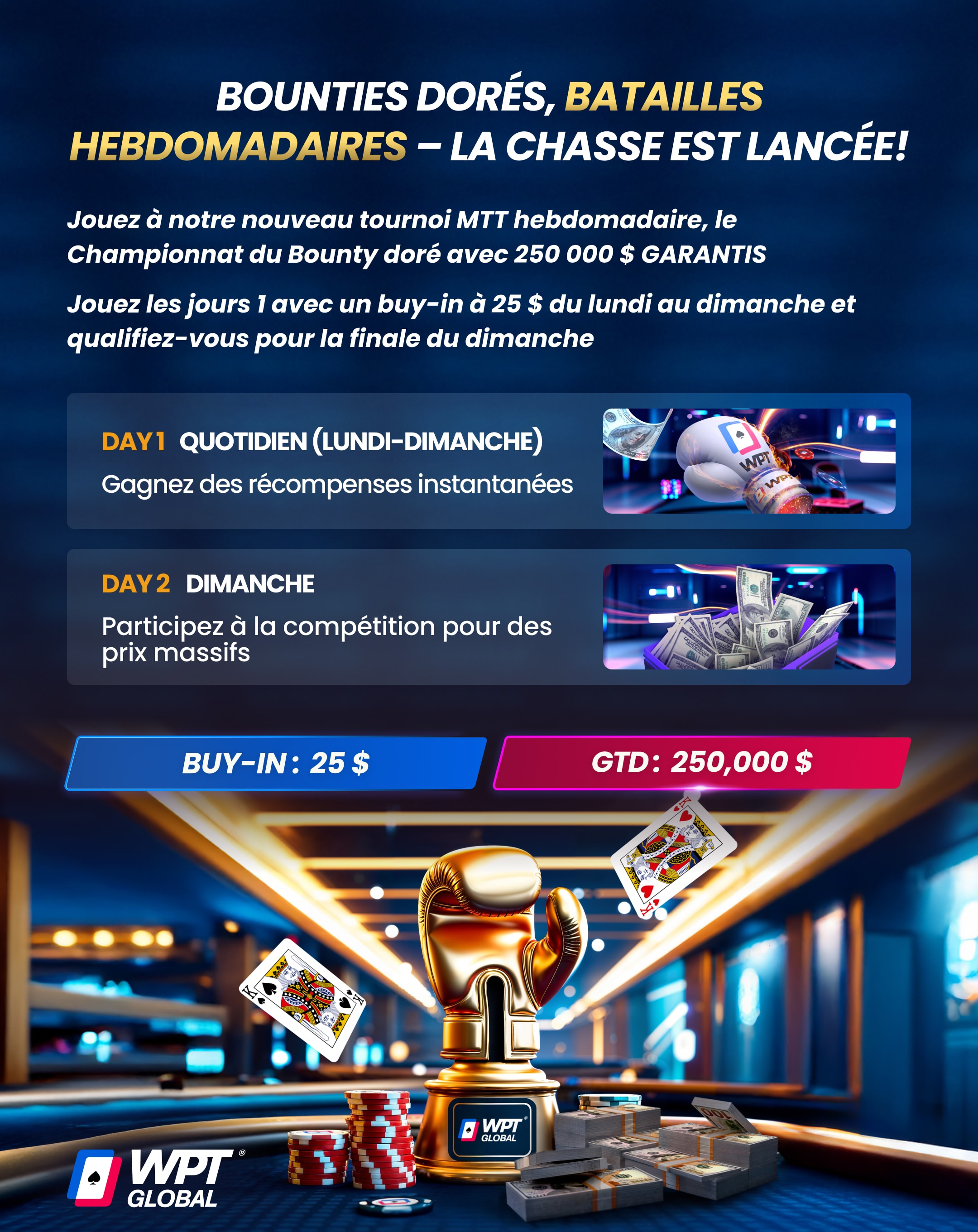 Obtenez un bonus de 100 % sur votre premier dépôt, jusqu’à 3 000 $ sur le site officiel du World Poker Tour
