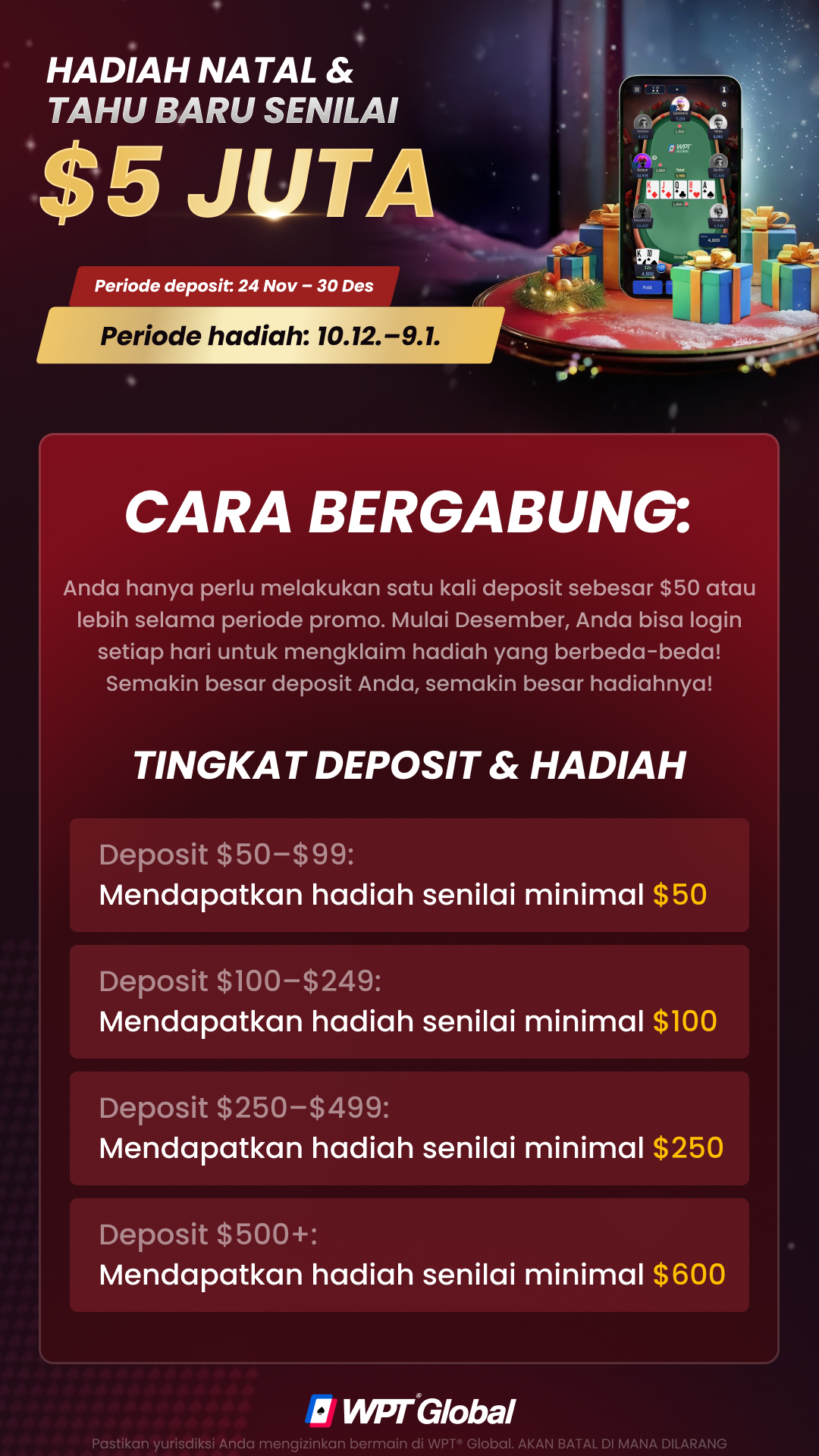 Rayakan musim liburan di WPT® Global dengan total $5 Juta hadiah gratis yang dibagikan sepanjang bulan Desember — cukup dengan login ke akunmu.