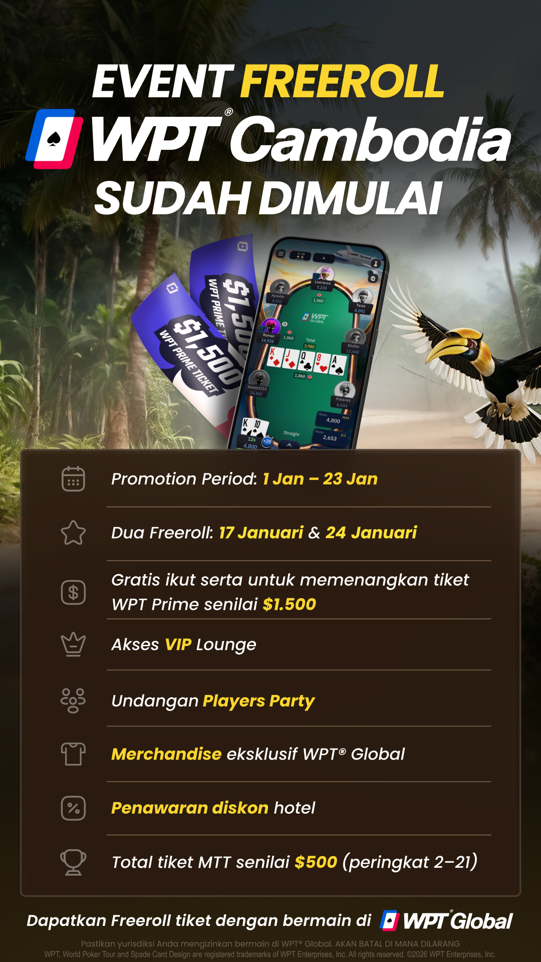 Ada minimal satu paket WPT® Cambodia $4.000 GTD plus tambahan 9x tiket $110 yang ditambahkan ke satelit $110 Qualifier mingguan kami, setiap Minggu pukul 20:30 (UTC+8) hingga 19 Januari 2026.