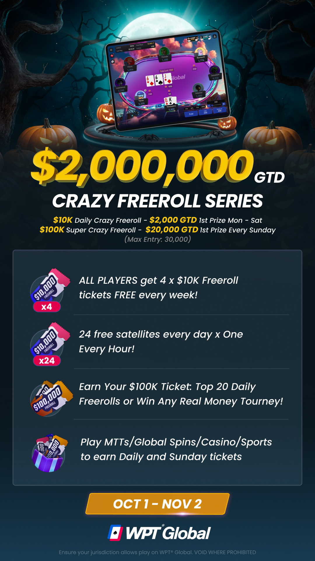 We’re going Freeroll Crazy at WPT® Global, giving away $2Million to you for FREE.