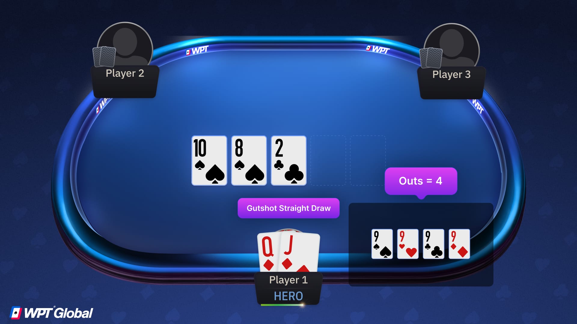 Gutshot Straight Draw | Q♦ J♦ on 10♠ 8♠ 2♣ board | 4 |
