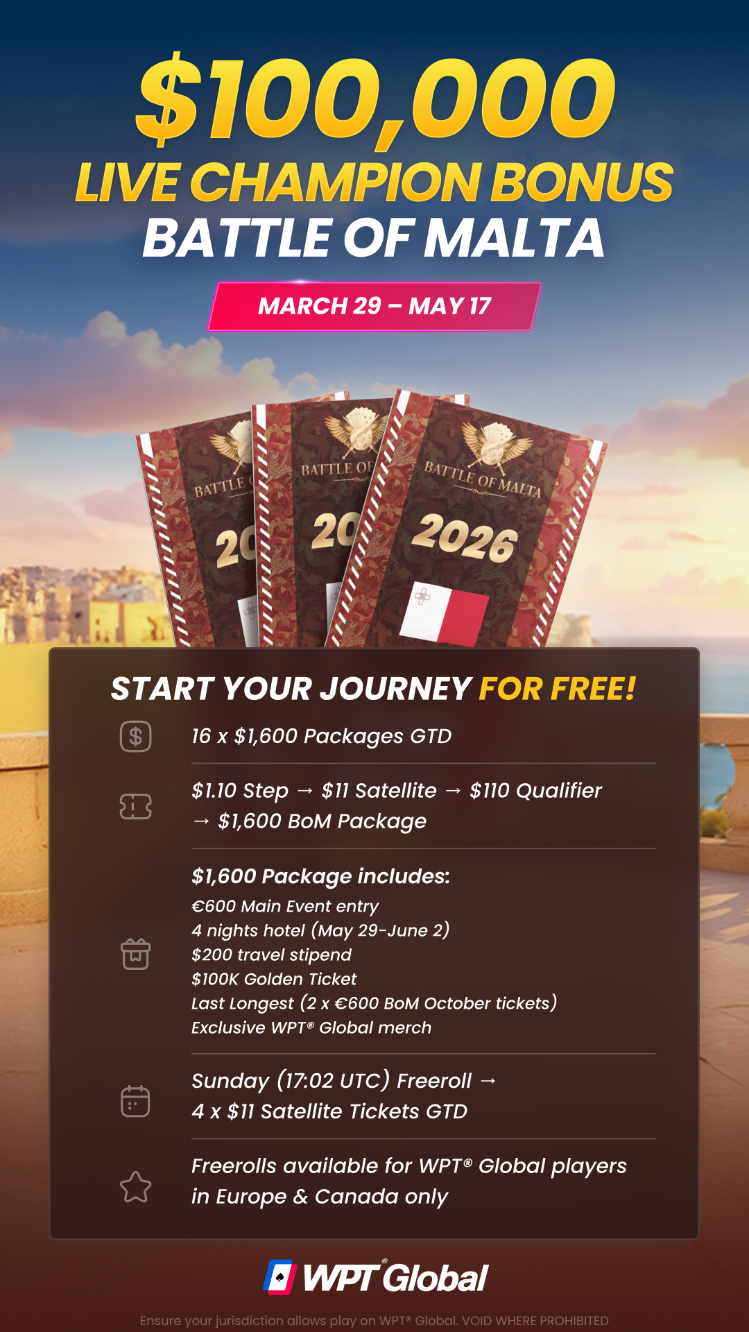 Win a package to the €700,000 GTD Battle of Malta with WPT® Global and we’ll give you an additional $100,000 bonus should you go on to win the main event.