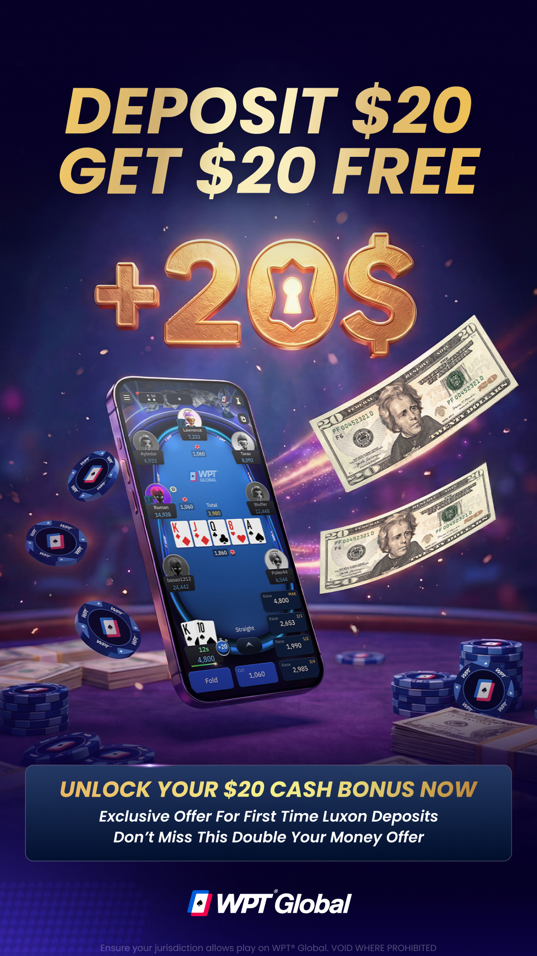 We’re giving all players $20 FREE when they use Luxon Pay to make a WPT® Global deposit for the first time.