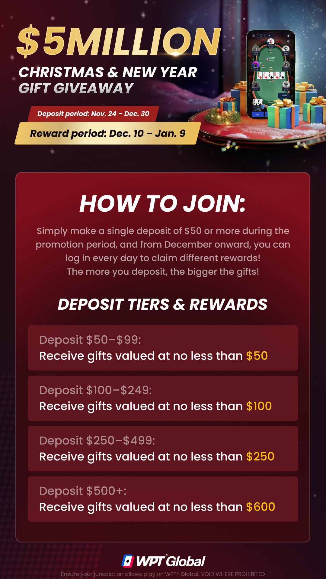 Celebrate the festive season at WPT® Global with $5Million in free gifts to be given away in December - just for logging into your account.
