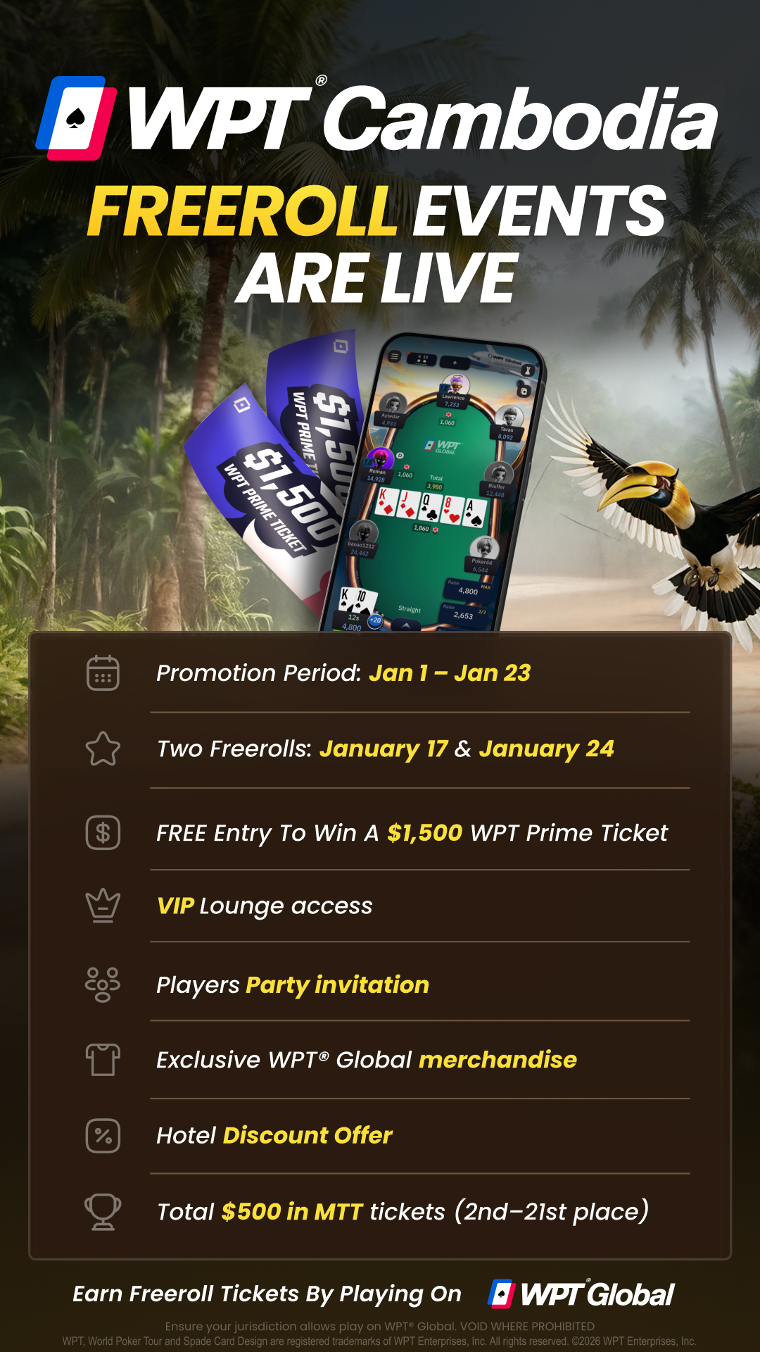 - $3,500 entry to the WPT® Cambodia Championship, which runs from Feb. 4-9 2026 at NagaWorld Phnom Penh
