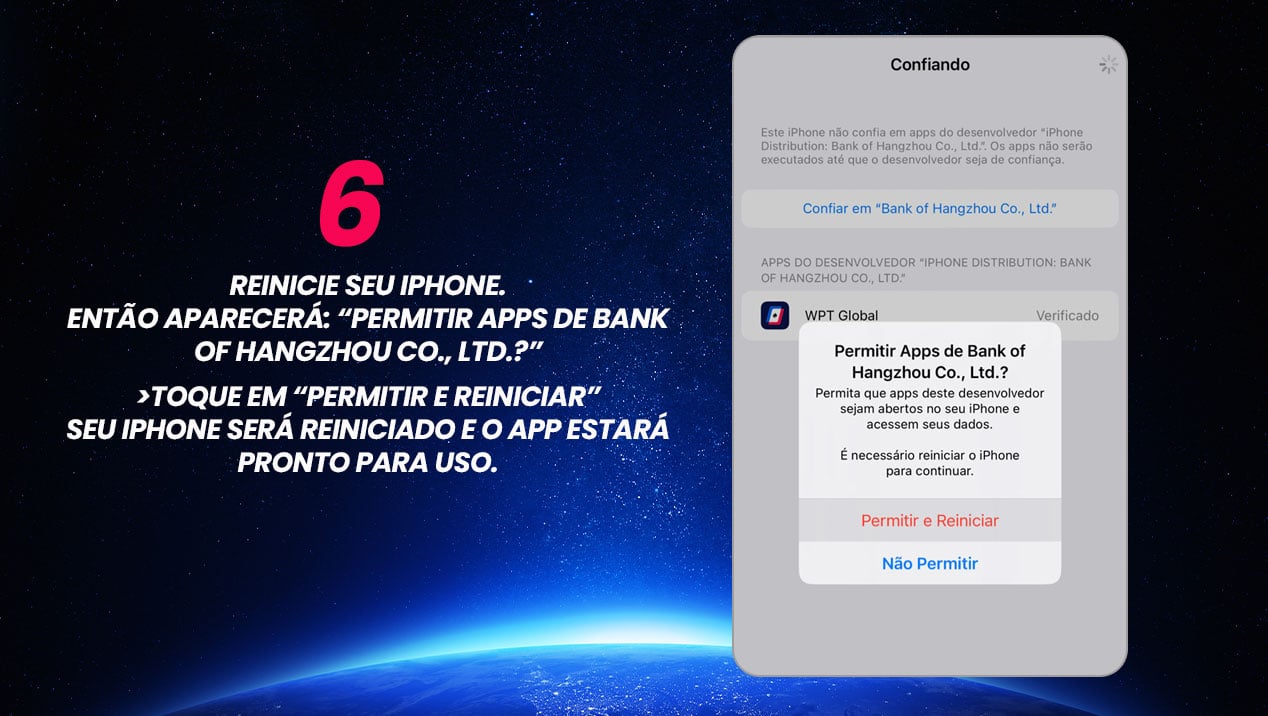 Ajustes > Geral > VPN e Gerenciamento de Dispositivo > Bank of Hangzhou Co., Ltd. > Confiar - Quando o sistema pedir, toque em “Permitir e Reiniciar”
