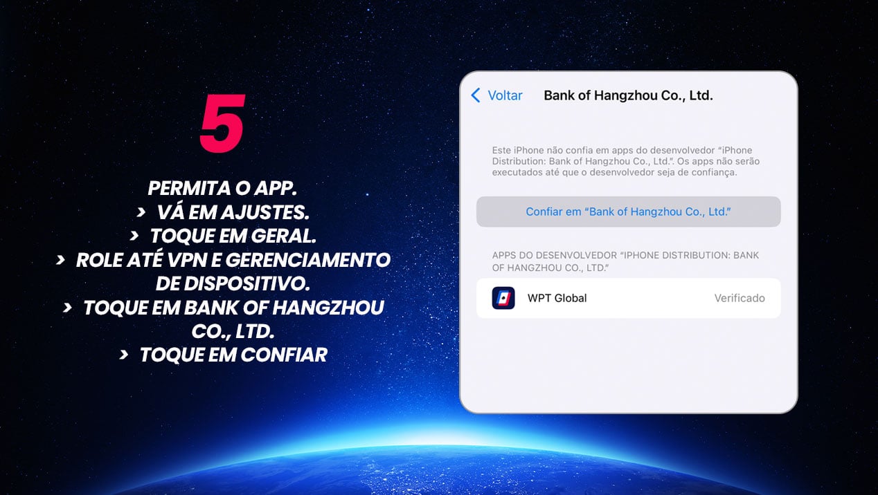 Apesar de ainda não estar listado na App Store brasileira, os usuários de iPhone podem baixar o aplicativo com segurança diretamente em www.wptglobal.com. Como se trata de uma instalação fora da loja oficial da Apple, o iOS pode exibir avisos de segurança — um comportamento padrão do sistema para qualquer app que não tenha sido baixado da App Store.