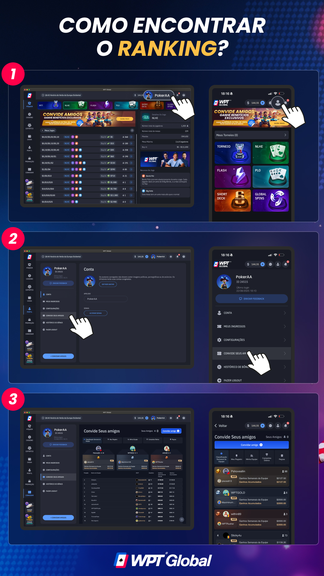 Convidar amigos é simples. Dentro do app WPT® Global, clique em ‘Convidar Amigos’ e seu link pessoal único de convite será gerado. Compartilhe-o via e-mail, Facebook ou X, ou apenas copie e envie-o pelo seu método de escolha!