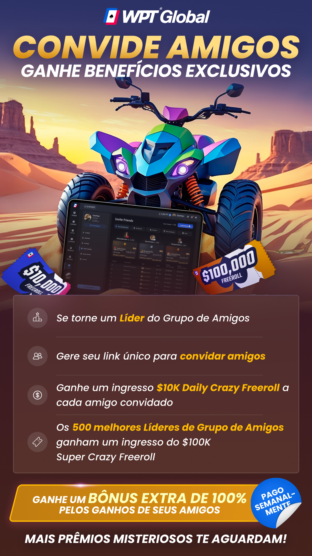 Traga seus amigos para o WPT® Global e ganhe recompensas sensacionais em nossa promoção do Grupo de Amigos Exclusivos.