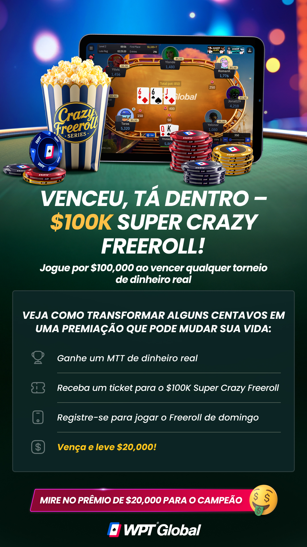 Crave qualquer torneio da WPT® Global e garanta sua vaga no próximo $100,000 Super Crazy Freeroll.