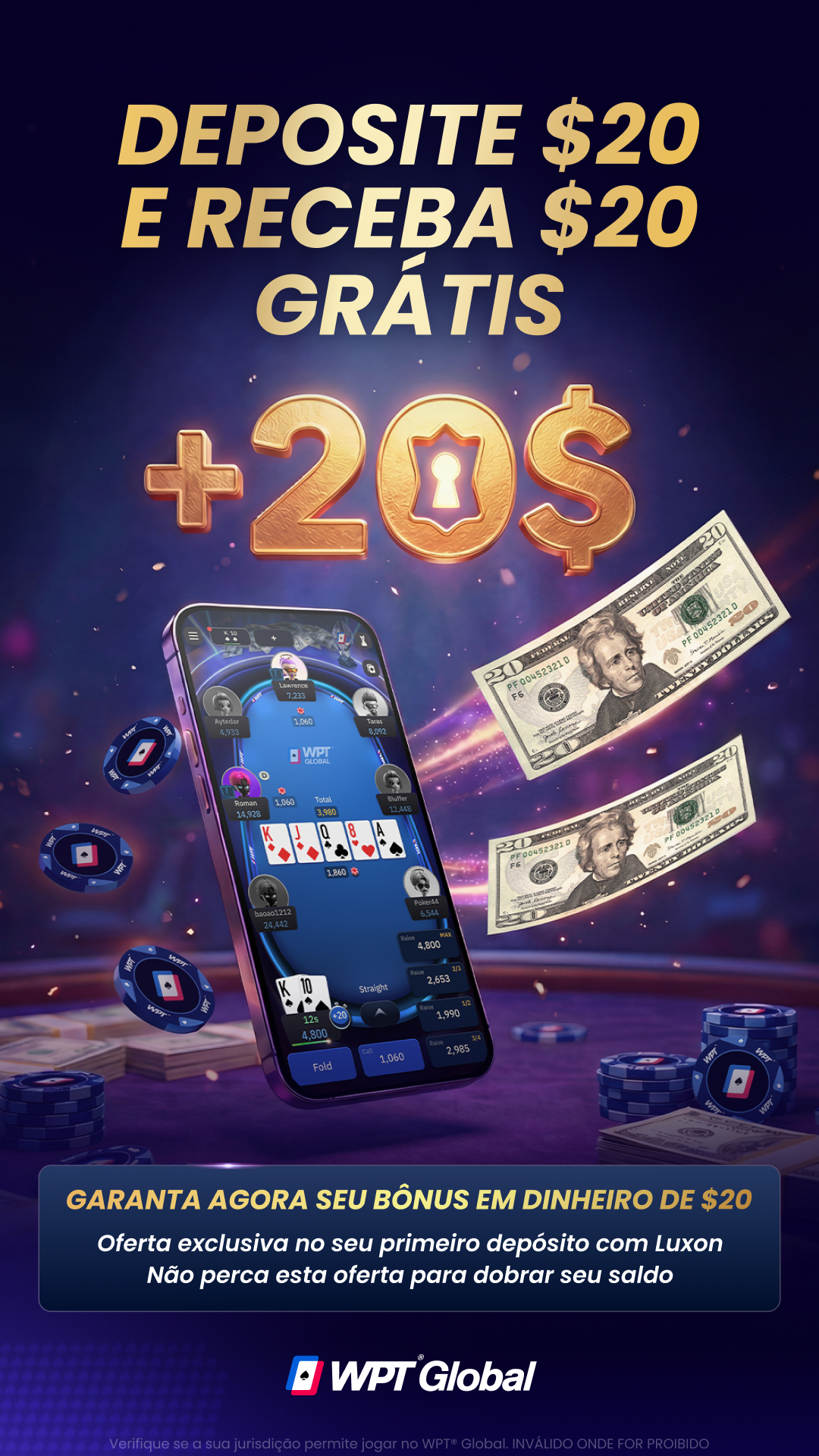 Ainda não usou a Luxon na WPT® Global? Aproveite agora e garanta seus $20 GRÁTIS em dinheiro.