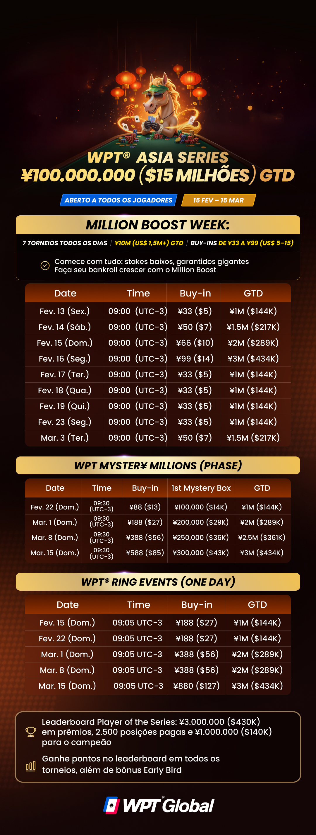 Estamos abrindo a WPT® Asia Series com a Million Boost Week (13–17 de fev.):