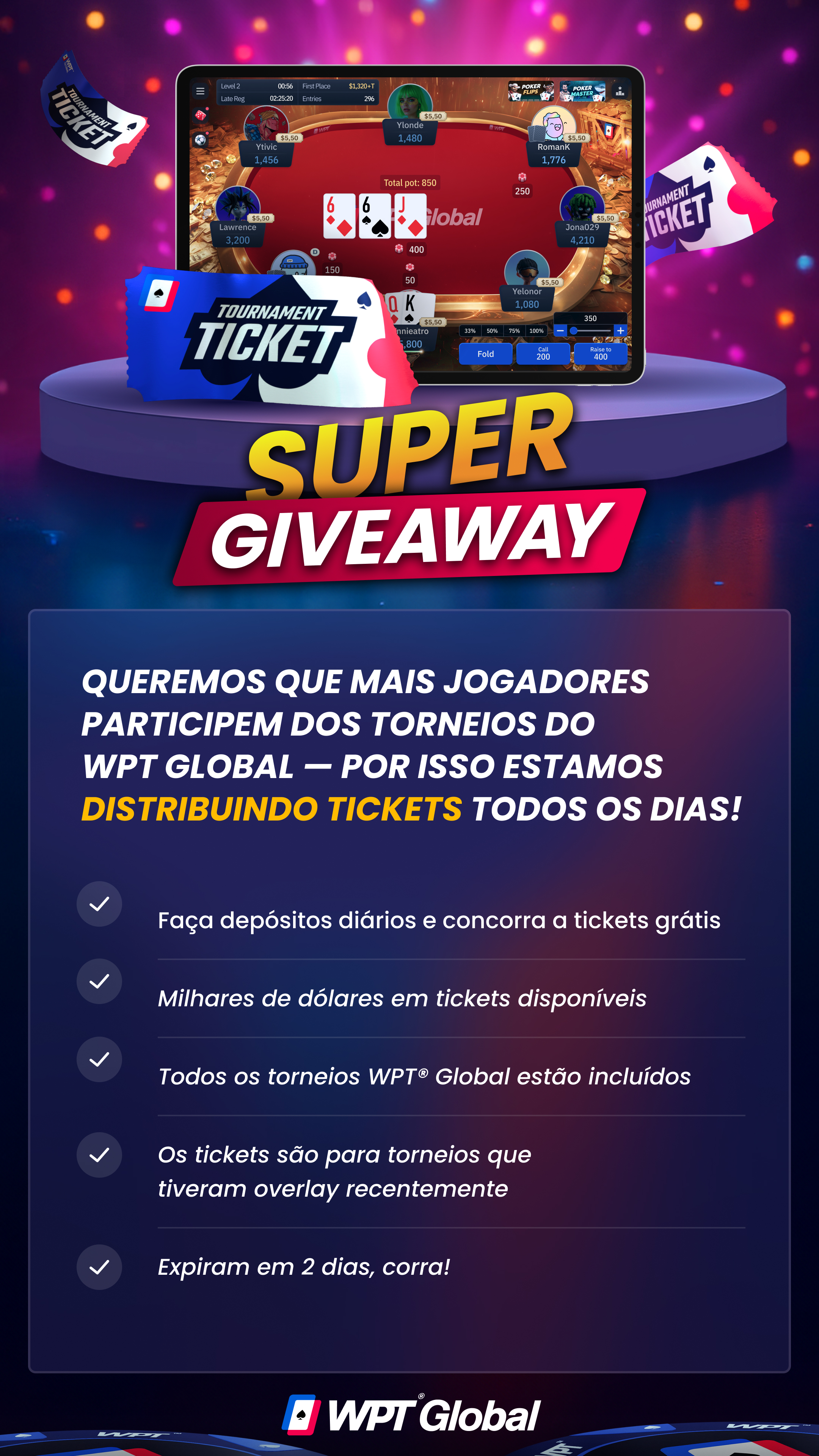 Com o WPT® Global Super Giveaway, você pode ganhar ENTRADAS GRÁTIS para qualquer torneio da grade com seu próximo depósito!