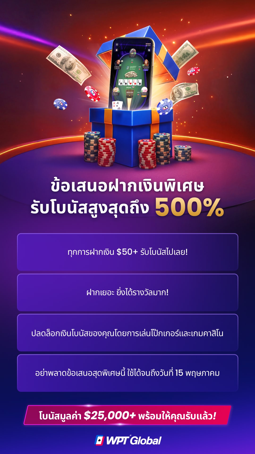 การฝากเงินที่มากขึ้นจะได้รับโบนัสที่คุ้มค่ามากขึ้น ซึ่งสามารถปลดล็อกได้จากการเล่นที่โต๊ะโป๊กเกอร์ของ WPT® Global