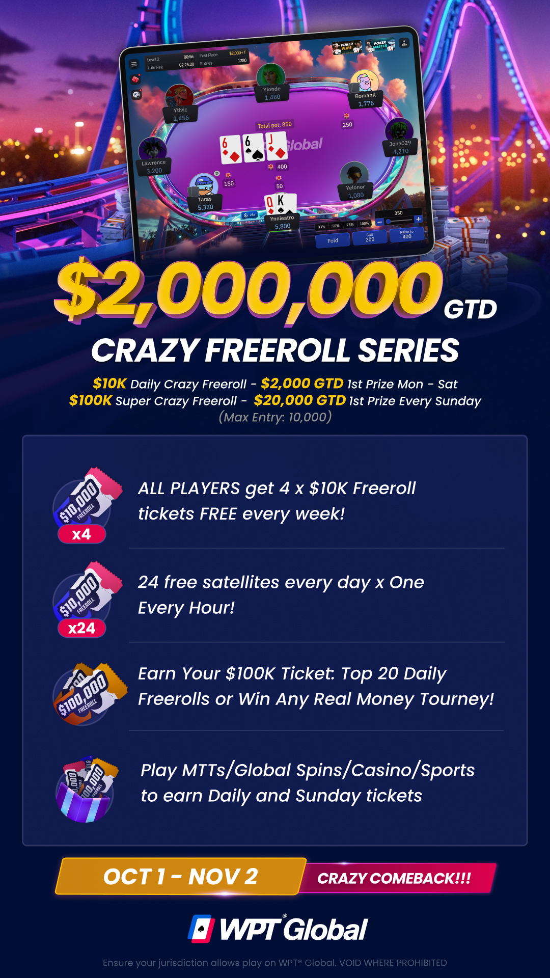 We’re going Freeroll Crazy at WPT® Global, giving away $2Million to you for FREE.