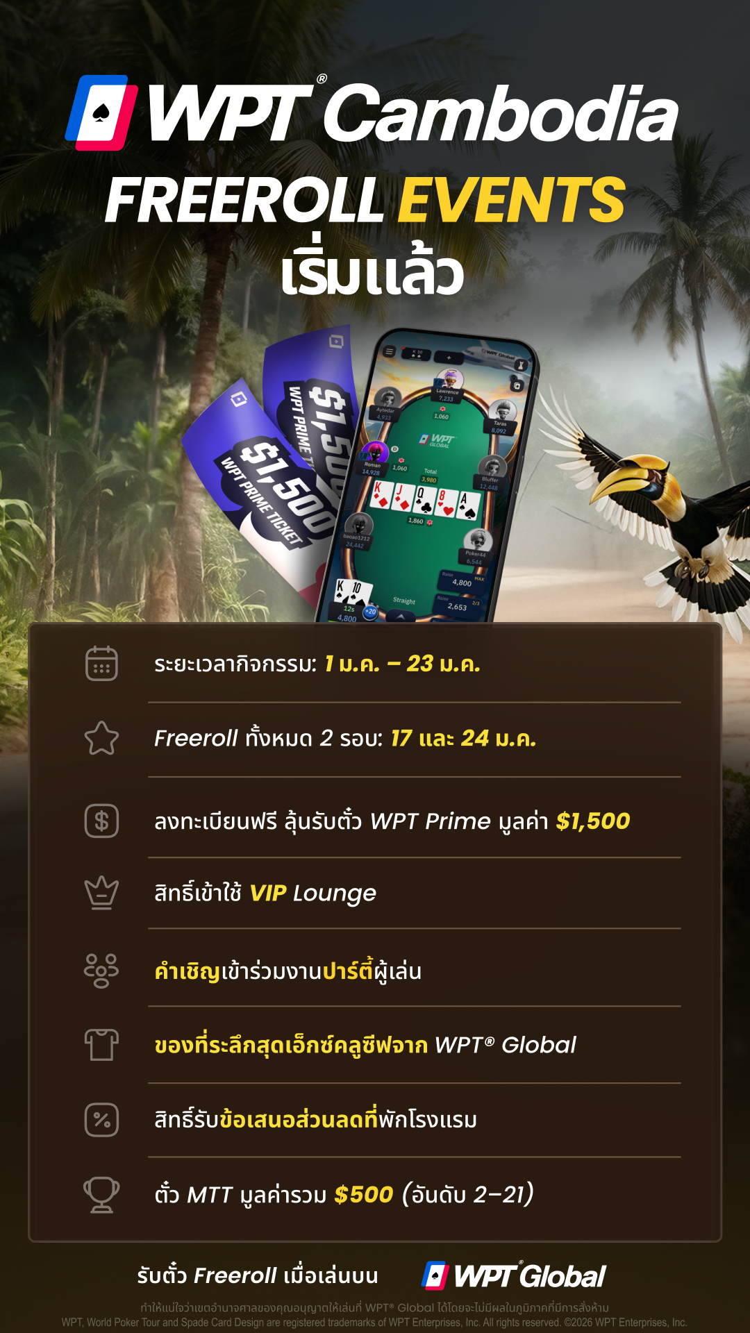 - สิทธิ์เข้าแข่งขัน WPT® Cambodia Championship มูลค่า $3,500 (จัดขึ้นวันที่ 4–9 ก.พ. 2026 ที่ NagaWorld Phnom Penh)
