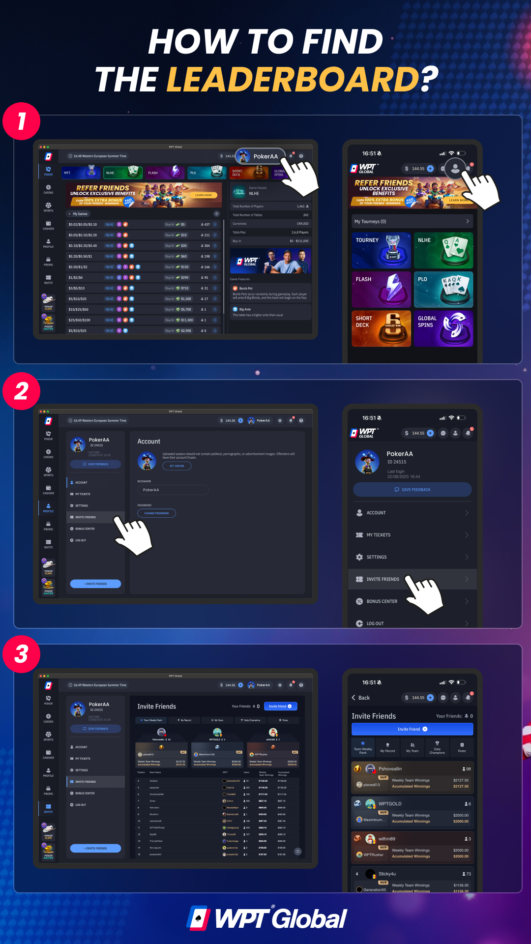 Referring friends is simple. Within the WPT® Global app or poker client, click ‘Invite Friends’ and your unique personal invite link will be generated. Share it via email, Facebook or X, or simply copy it and send it out in any other way you choose!