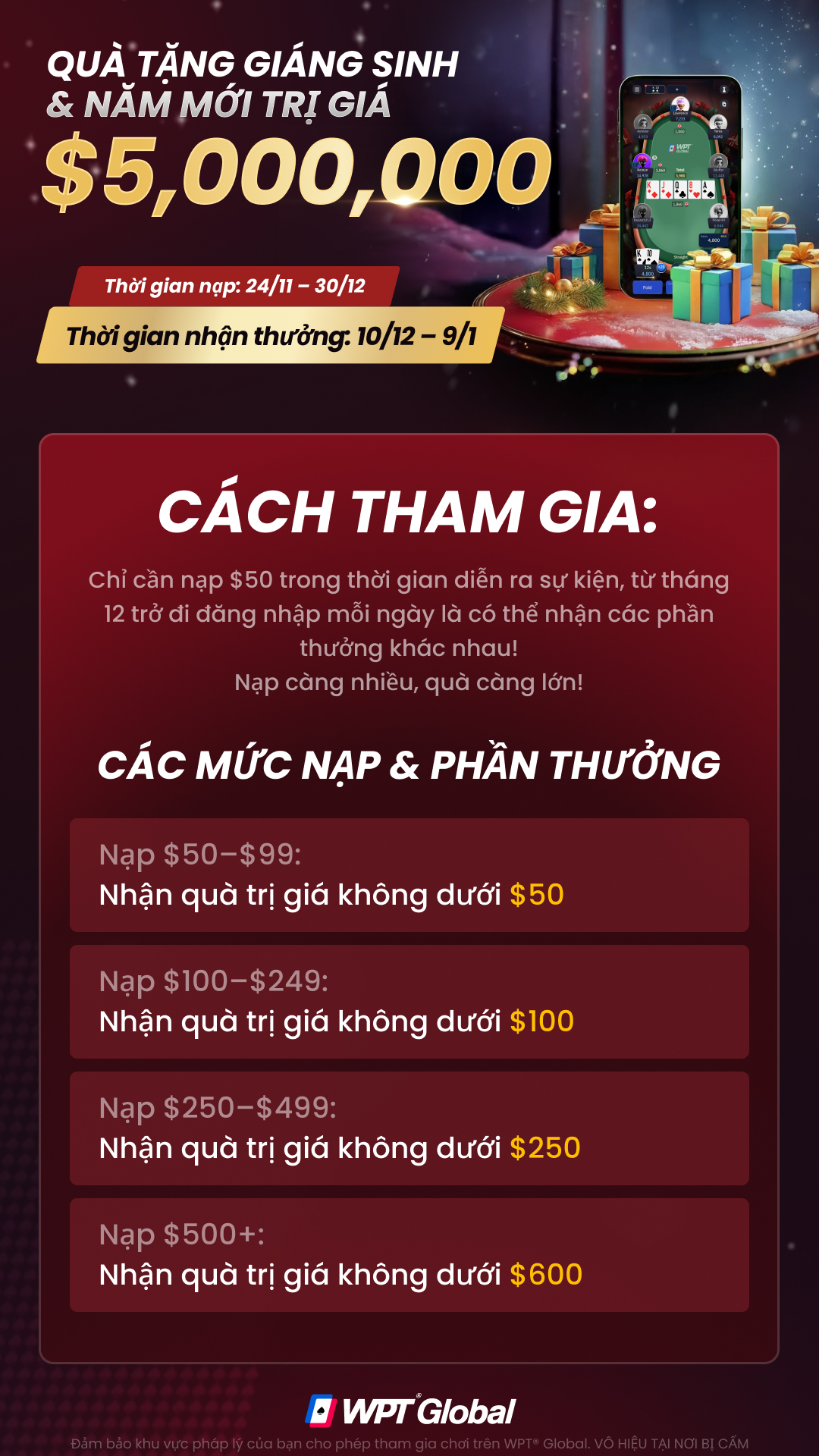 Hãy cùng chào đón mùa lễ hội tại WPT® Global với $5,000,000 quà tặng miễn phí sẽ được trao trong tháng 12 — chỉ cần đăng nhập tài khoản là có cơ hội nhận quà.