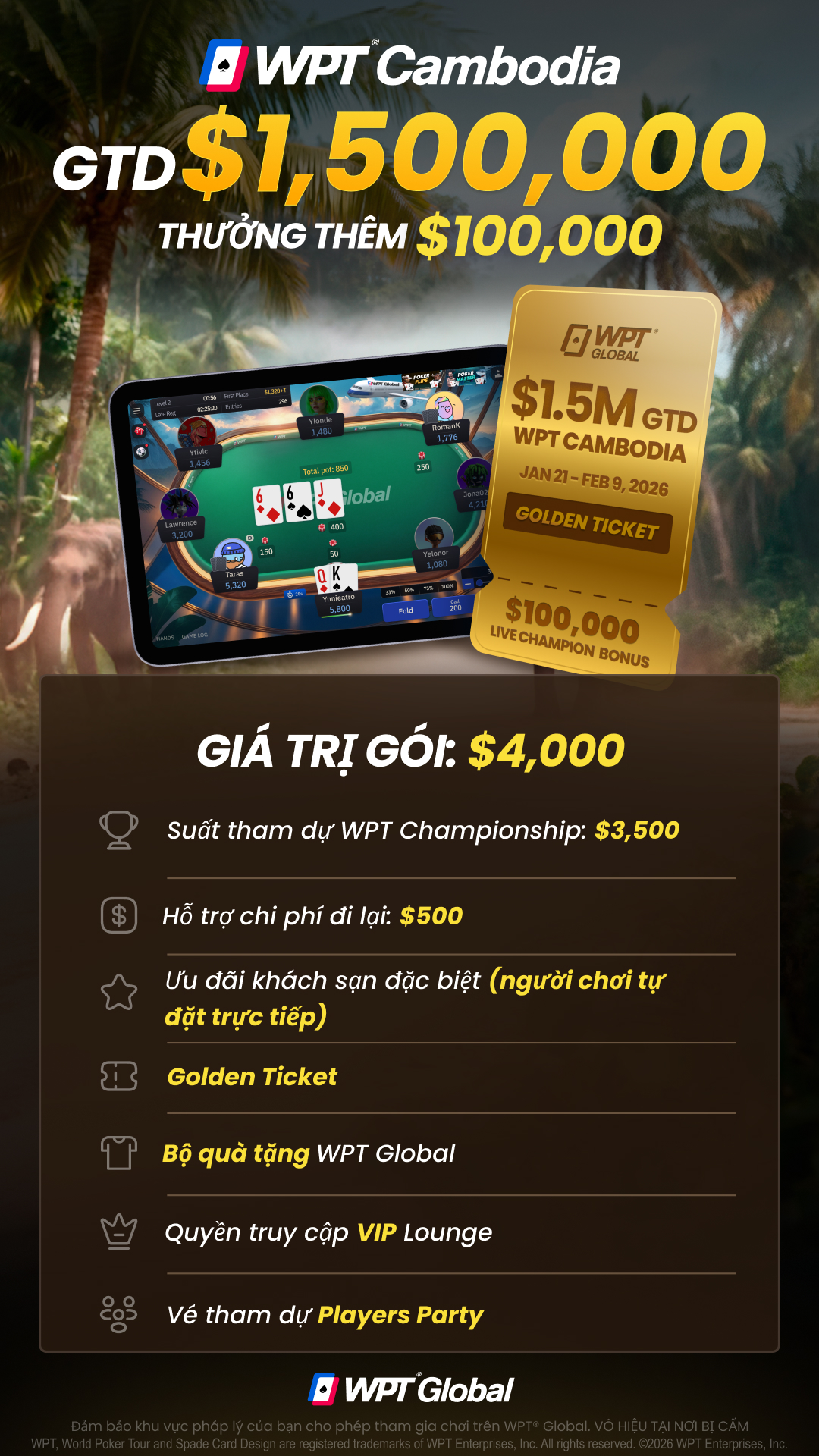- $3,500 phí tham dự giải WPT® Cambodia Championship, diễn ra từ 4–9 tháng 2 năm 2026 tại NagaWorld Phnom Penh