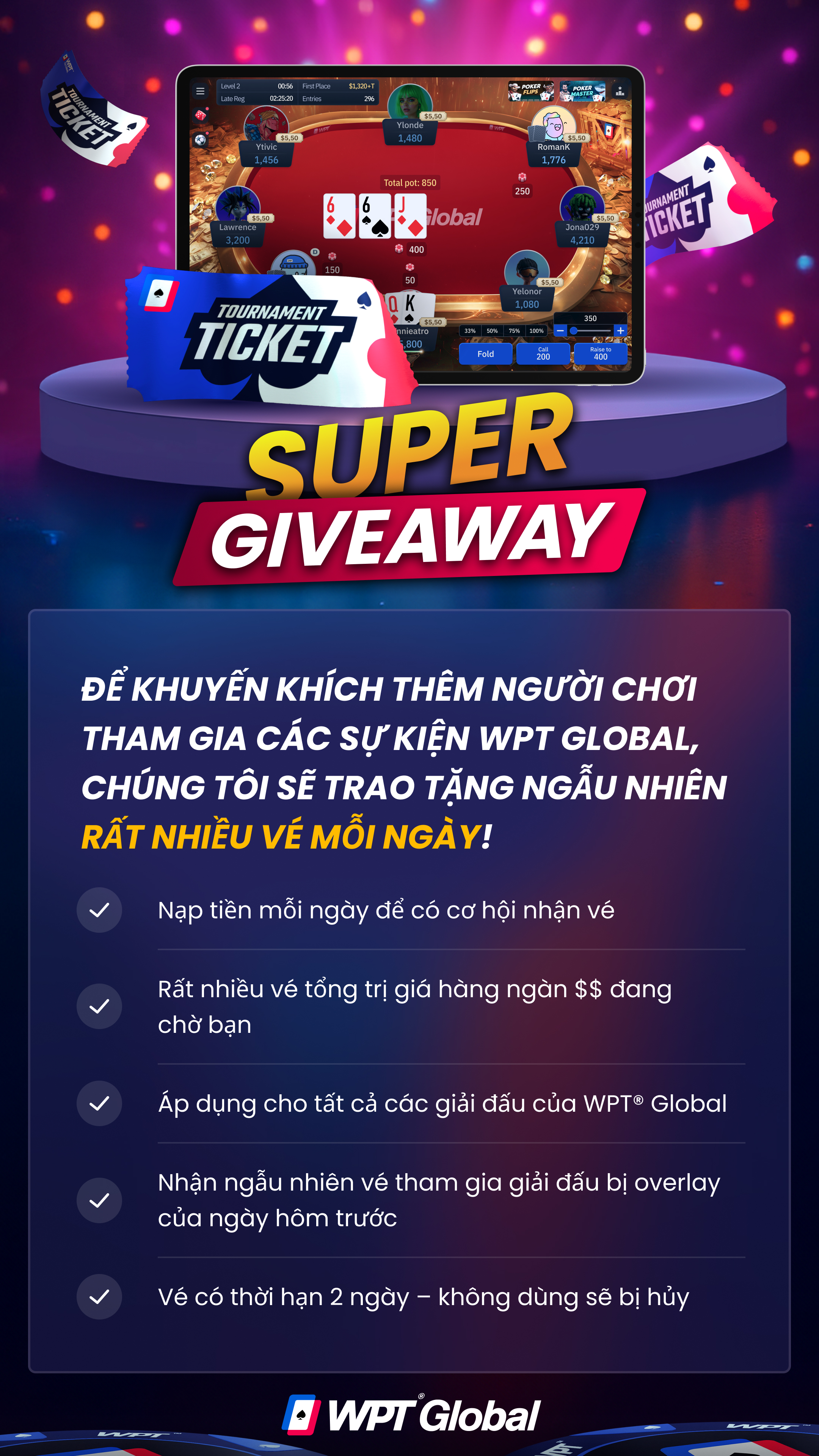 Nhận VÉ MIỄN PHÍ vào bất kỳ giải đấu nào trong lịch trình của WPT® Global với lần nạp tiền tiếp theo của bạn, trong chương trình Super Giveaway của WPT® Global.