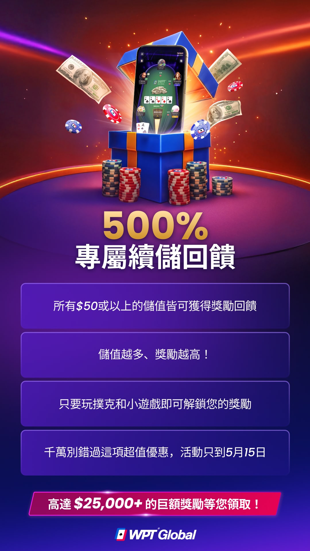 透過您的下一筆儲值,獲得高達500%的續儲獎勵,迅速提升您的資金!