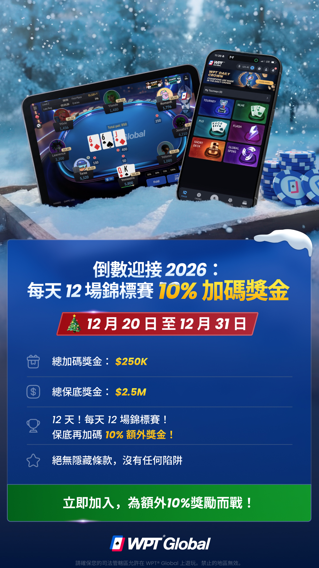 倒數迎接 2026:每天 12 場錦標賽 10% 加碼獎金
