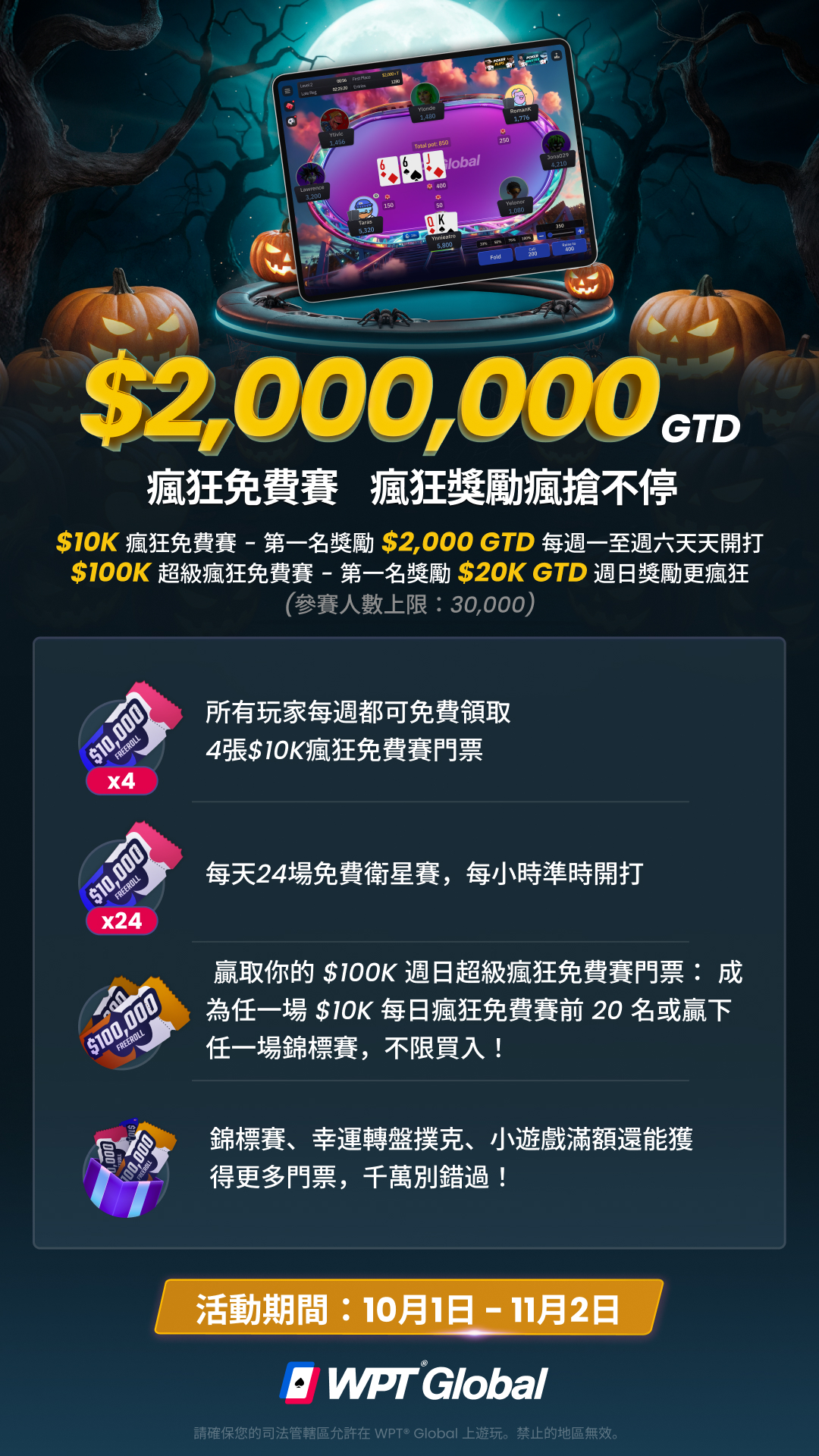 - 每天有24場免費衛星賽,每場都將送出20張 $10K 每日瘋狂免費賽門票