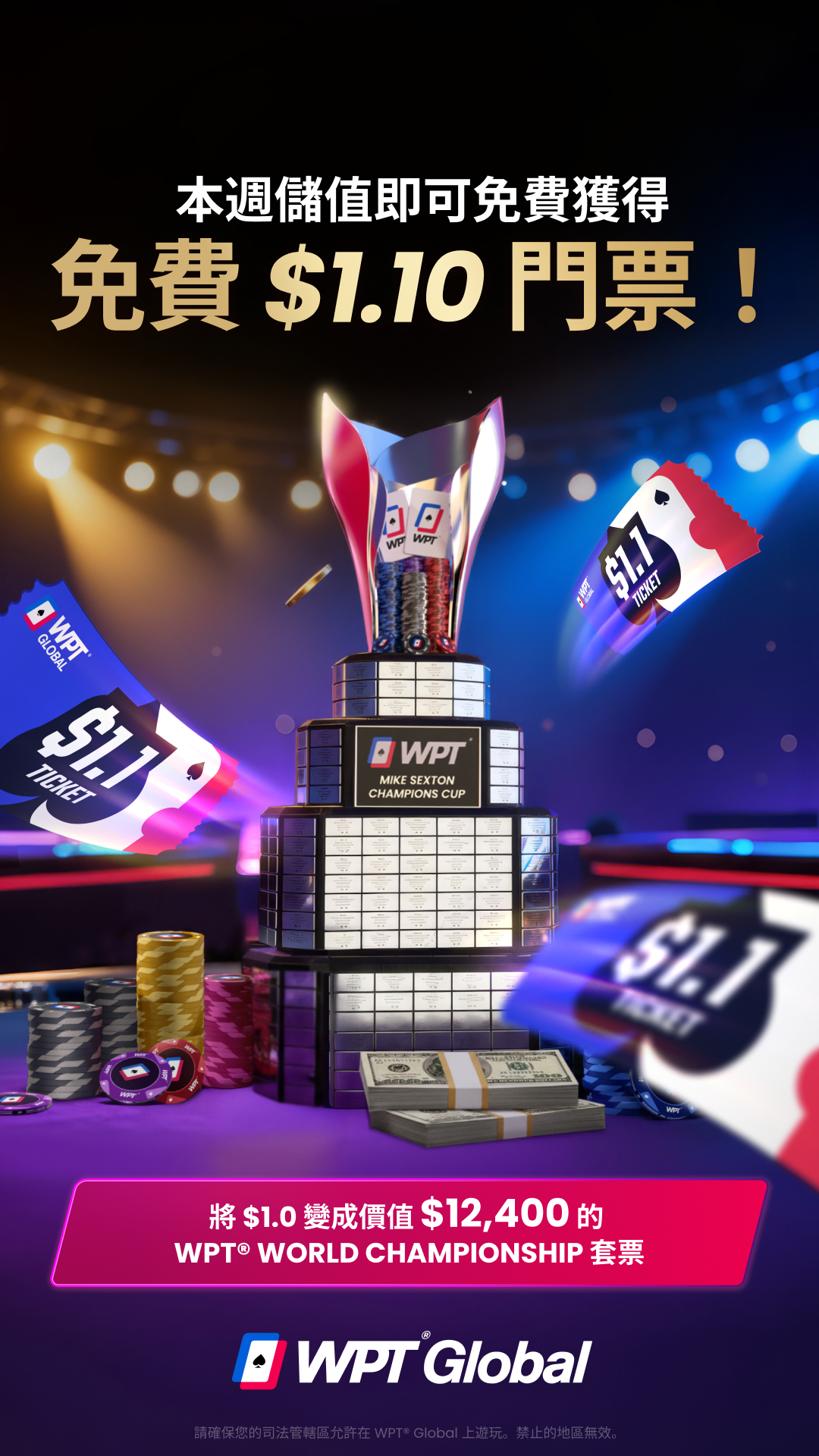 只要在每週一至週日儲值任意金額,即可獲得一張免費 $1.10 階段衛星賽門票,開啟您贏取 $12,400 WPT® World Championship 套票、通往拉斯維加斯的道路!