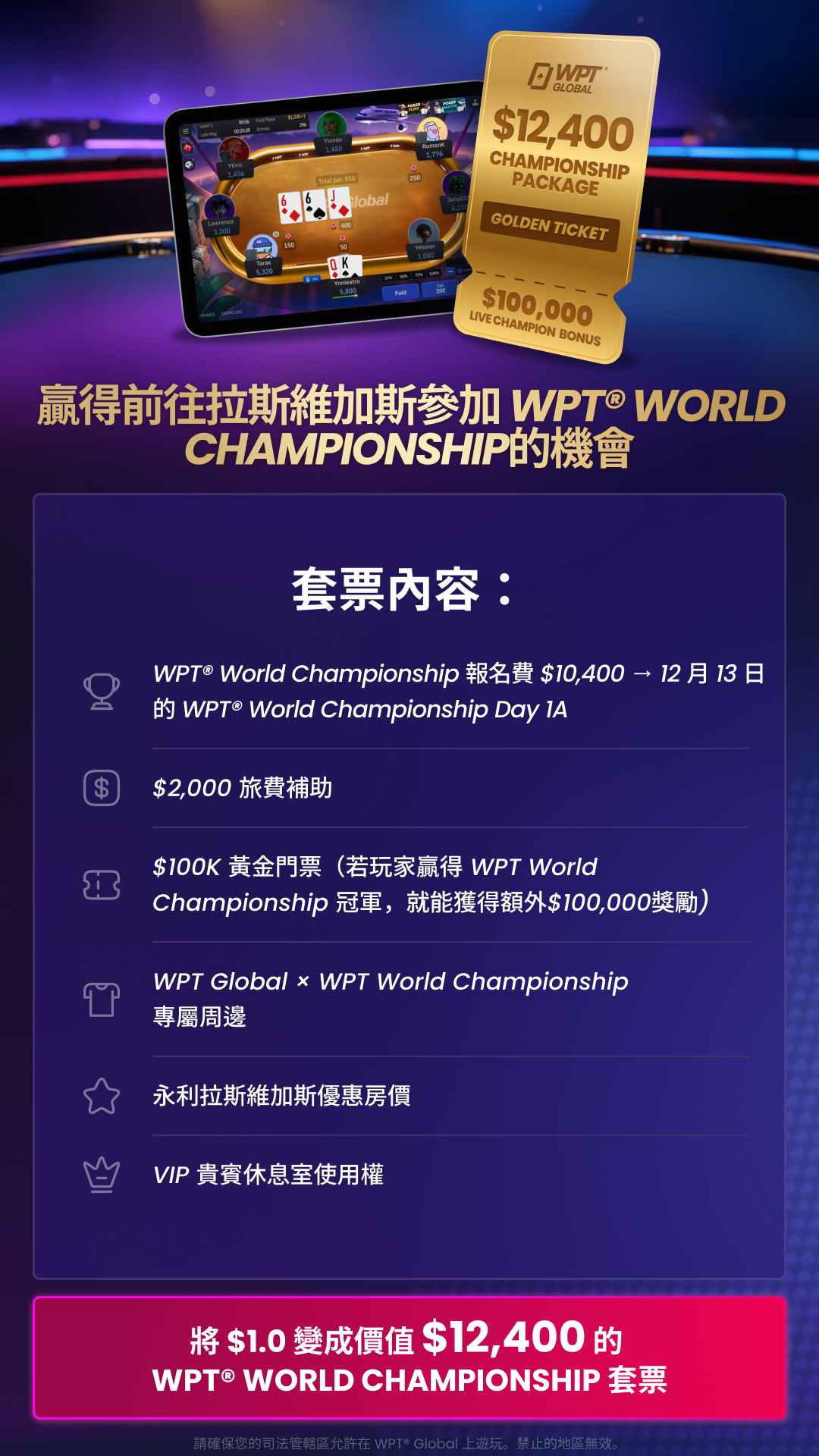$10,400WPT® World Championship主賽門票(2025 年 12 月 13–21 日於拉斯維加斯永利酒店舉行) - $2,000 旅費補助(直接發放至您的 WPT® Global 帳戶)