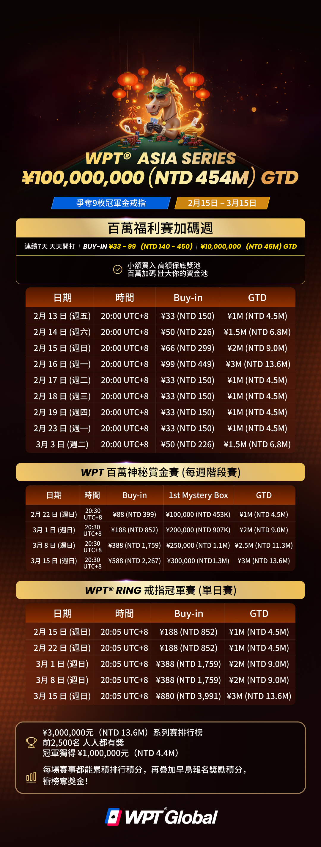 2 月 15 日至 3 月 15 日,準備好為我們首發WPT® 戒指冠軍而戰!WPT® Asia Series 總保底高達 ¥100,000,000(約 NTD 454M)!