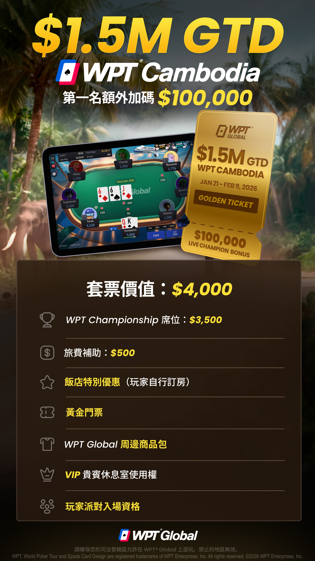 於每週日 20:30 (UTC+8) 舉行的 $110 資格賽衛星賽中,至少保證贈送一份 $4,000 WPT® Cambodia 套票,以及 9 張 $110 門票,直至 2026 年 1 月 19 日。